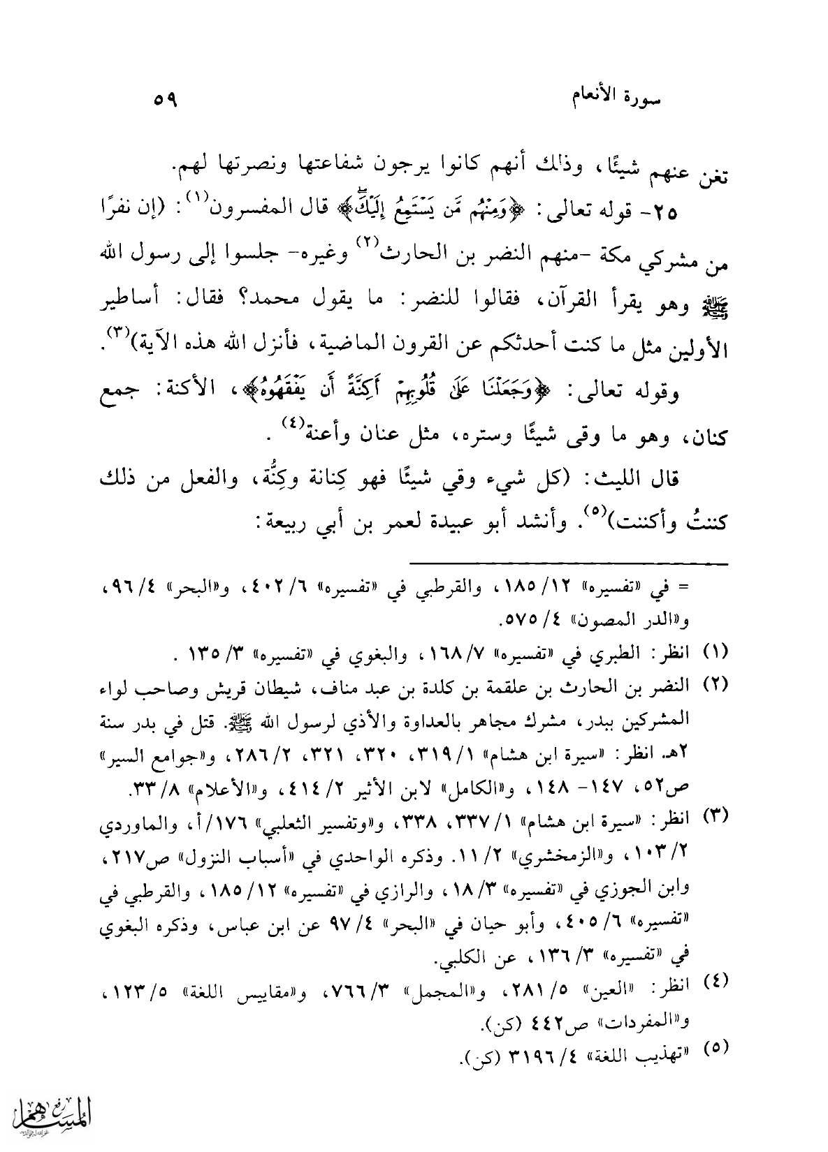 25 - قوله تعالى: {وَمِنْهُمْ مَنْ يَسْتَمِعُ إِلَيْكَ} قال المفسرون (¬1): (إن نفرًا من مشركي مكة -منهم النضر بن الحارث (¬2) وغيره- جلسوا إلى رسول الله - صلى الله عليه وسلم - وهو يقرأ القرآن، فقالوا للنضر: ما يقول محمد؟ فقال: أساطير الأولين مثل ما كنت أحدثكم عن القرون الماضية، فأنزل الله هذه الآية) (¬3).