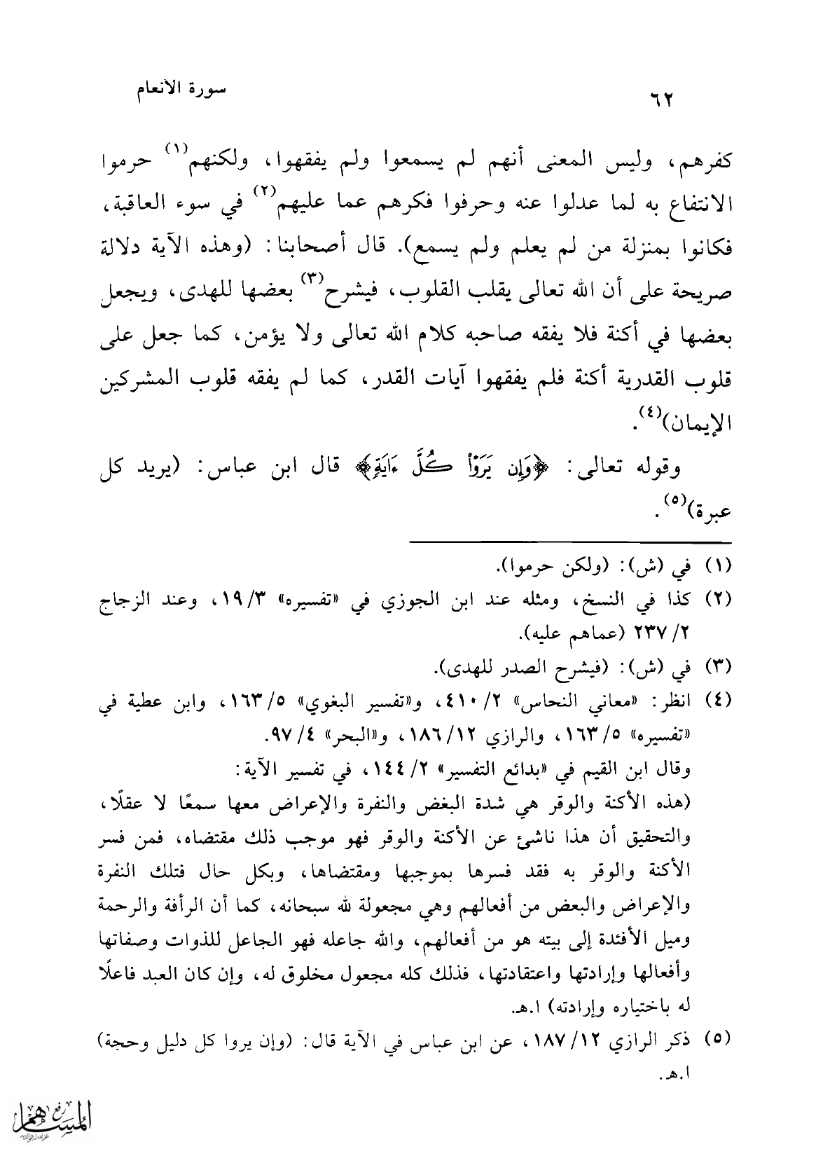 (هذه الأكنة والوقر هي شدة البغض والنفرة والإعراض معها سمعًا لا عقلاً، والتحقيق أن هذا ناشئ عن الأكنة والوقر فهو موجب ذلك مقتضاه، فمن فسر الأكنة والوقر به فقد فسرها بموجبها ومقتضاها، وبكل حال فتلك النفرة والإعراض والبعض من أفعالهم وهي مجعولة لله سبحانه، كما أن الرأفة والرحمة وميل الأفئدة إلى بيته هو من أفعالهم، والله جاعله فهو الجاعل للذوات وصفاتها وأفعالها وإرادتها واعتقادتها، فذلك كله مجعول مخلوق له، وإن كان العبد فاعلًا له باختياره وإرادته) ا. هـ.