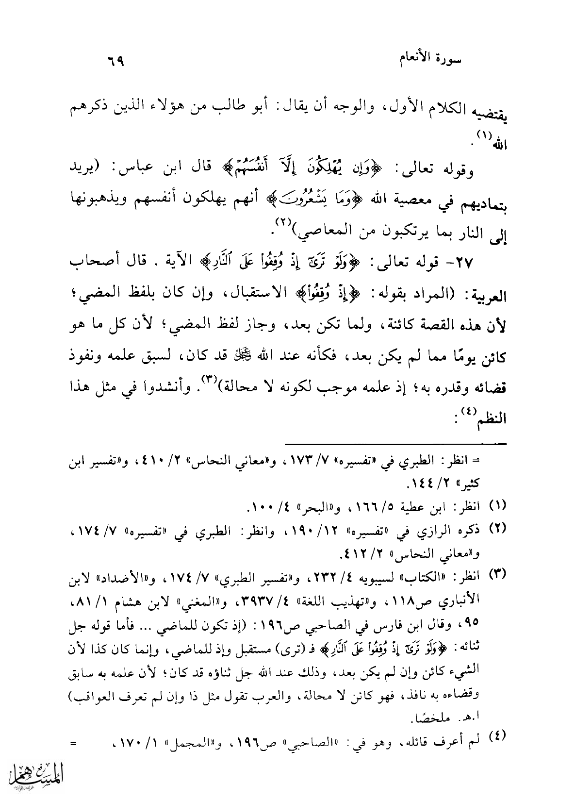 27 - قوله تعالى: {وَلَوْ تَرَى إِذْ وُقِفُوا عَلَى النَّارِ} الآية. قال أصحاب العربية: (المراد بقوله: {إِذْ وُقِفُوا} الاستقبال، وإن كان بلفظ المضي؛ لأن هذه القصة كائنة، ولما تكن بعد، وجاز لفظ المضي؛ لأن كل ما هو كائن يومًا مما لم يكن بعد، فكأنه عند الله عز وجل قد كان، لسبق علمه ونفوذ قضائه وقدره به؛ إذ علمه موجب لكونه لا محالة) (¬3). وأنشدوا في مثل هذا النظم (¬4):