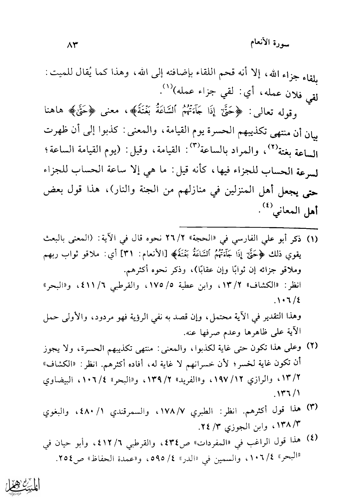 (¬1) ذكر أبو علي الفارسي في "الحجة" 2/ 26 نحوه قال في الآية: (المعنى بالبعث يقوي ذلك {حَتَّى إِذَا جَاءَتْهُمُ السَّاعَةُ بَغْتَةً} [الأنعام: 31] أي: ملاقو ثواب ربهم وملاقو جزائه إن ثوابًا وإن عقابًا)، وذكر نحوه أكثرهم.