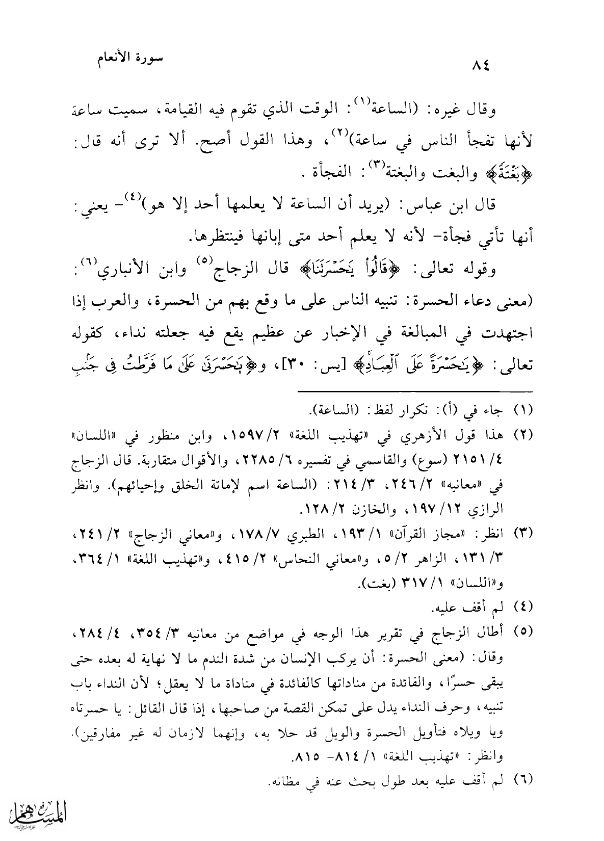 (¬2) هذا قول الأزهري في "تهذيب اللغة" 2/ 1597، وابن منظور في "اللسان" 4/ 2151 (سوع) والقاسمي في تفسيره 6/ 2285، والأقوال متقاربة. قال الزجاج في "معانيه" 2/ 246، 3/ 214: (الساعة اسم لإماتة الخلق واحيائهم). وانظر الرازي 12/ 197، والخازن 2/ 128.