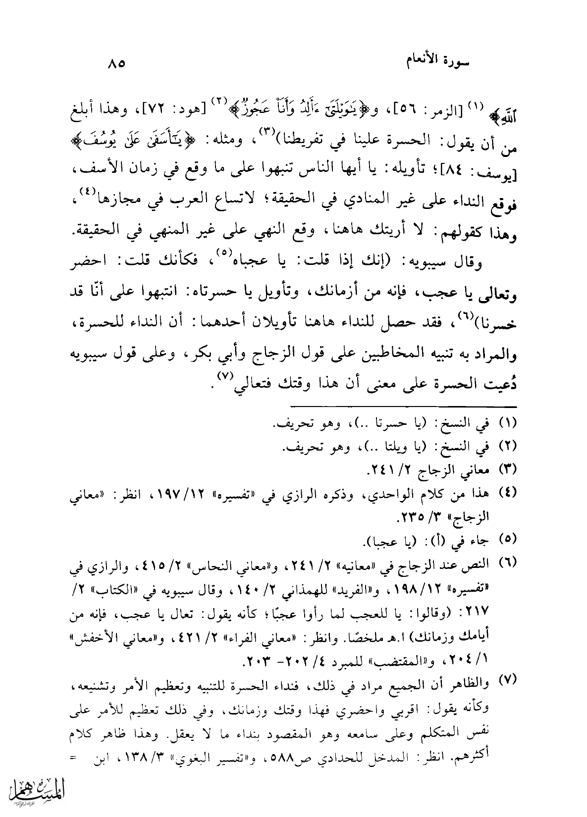 وقال سيبويه: (إنك إذا قلت: يا عجباه (¬5)، فكأنك قلت: احضر وقال يا عجيب، فإنه من أزمانك، وتأويل يا حسرتاه: انتبهوا على أنّا قد خسرنا) (¬6)، فقد حصل للنداء هاهنا تأويلان أحدهما: أن النداء للحسرة، والمراد به تنبيه المخاطبين على قول الزجاج وأبي بكر، وعلى قول سيبويه دُعيت الحسرة على معنى أن هذا وقتك فتعالي (¬7).