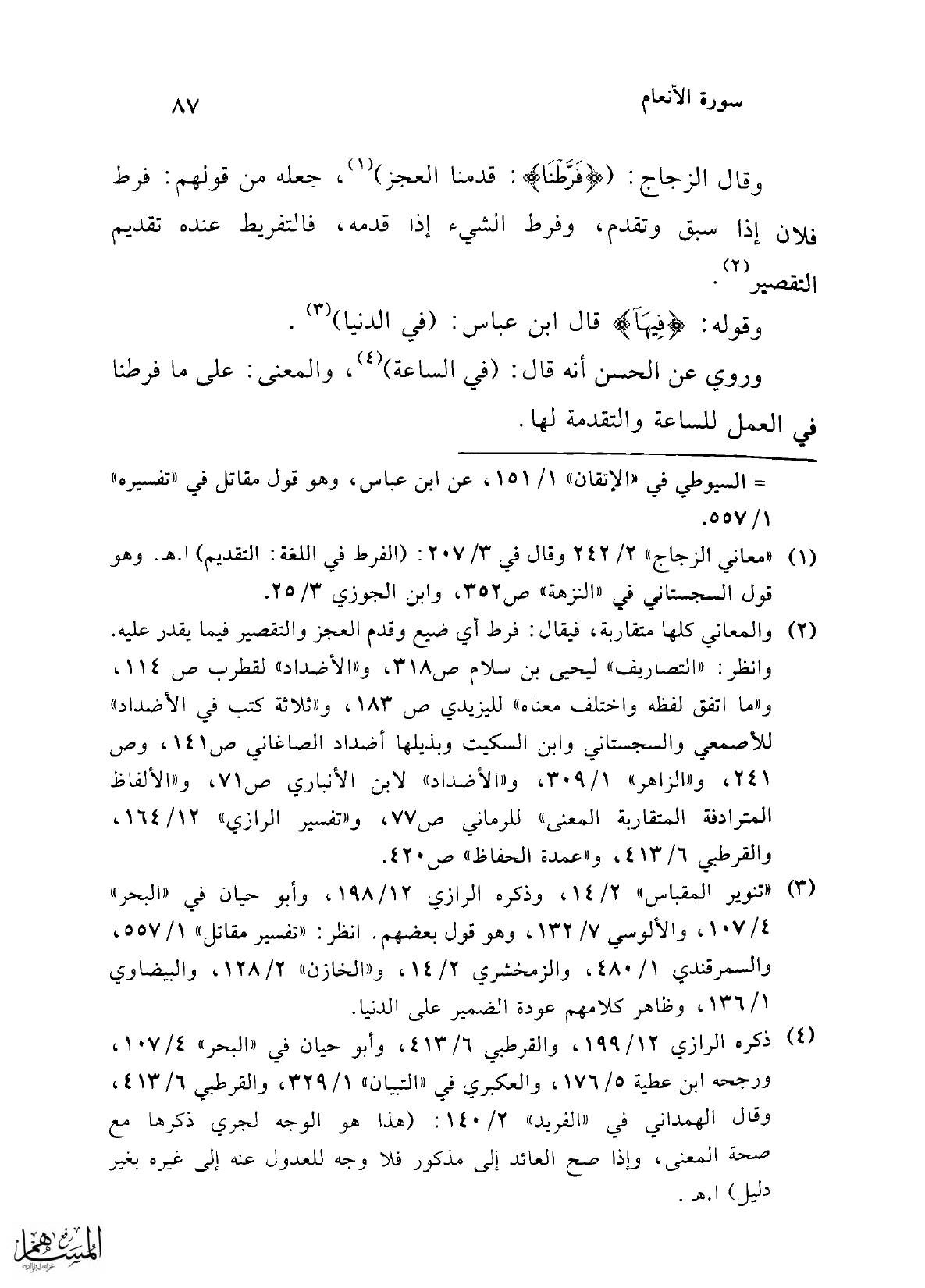 (¬1) "معاني الزجاج" 2/ 242 وقال في 3/ 207: (الفرط في اللغة: التقديم) ا. هـ. وهو قول السجستاني في "النزهة" ص 352، وابن الجوزي 3/ 25.