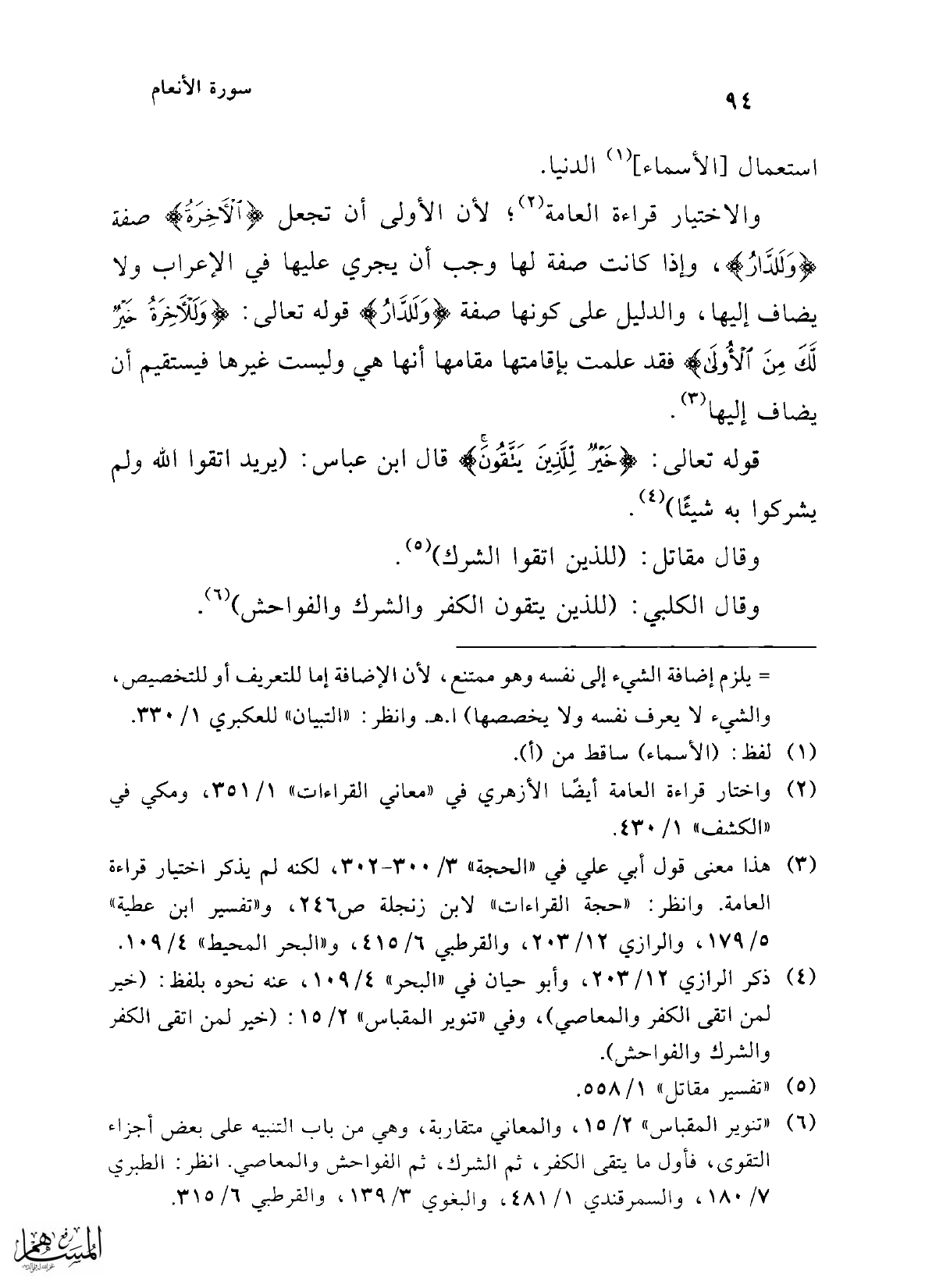 (¬6) "تنوير المقباس" 2/ 15، والمعاني متقاربة، وهي من باب التنبيه على بعض أجزاء التقوى، فأول ما يتقى الكفر، ثم الشرك؛ ثم الفواحش والمعاصي. انظر: الطبري 7/ 180، والسمرقندي 1/ 481، والبغوي 3/ 139، والقرطبي 6/ 315.