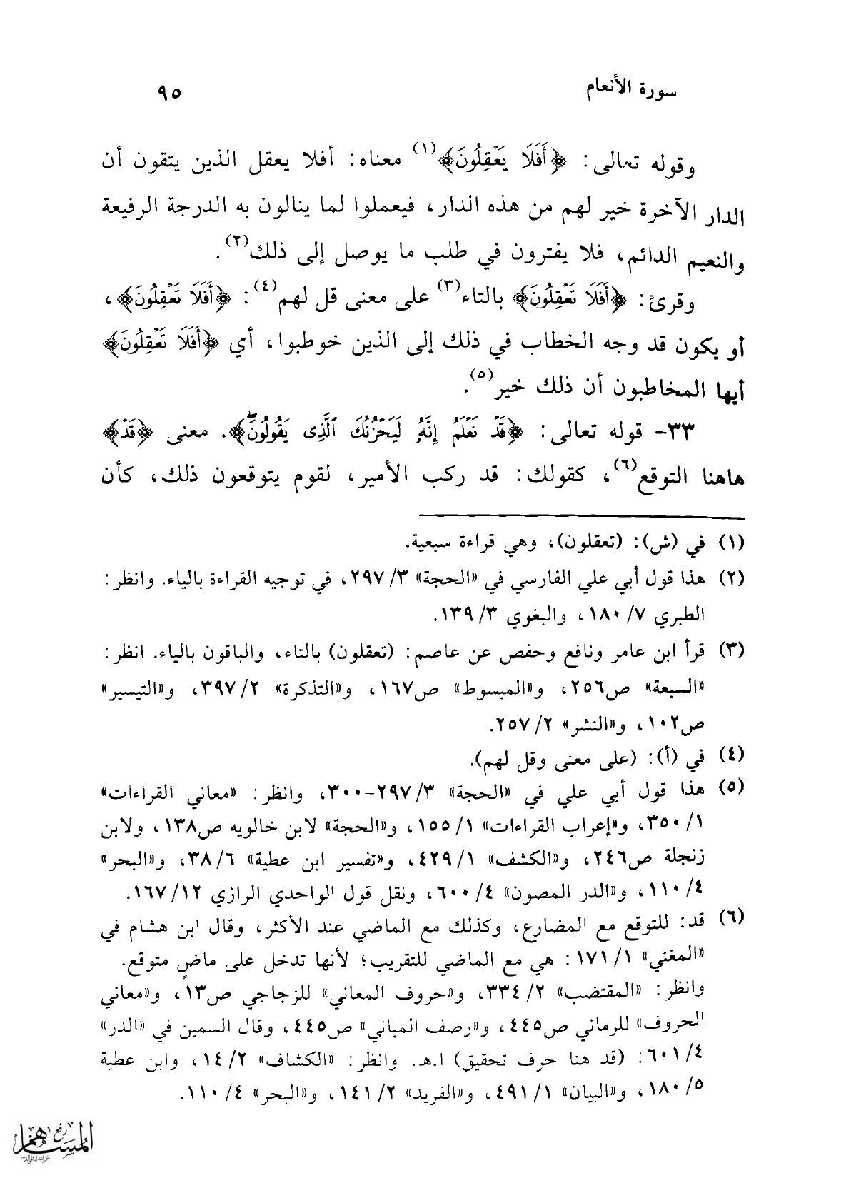 33 - قوله تعالى: {قَدْ نَعْلَمُ إِنَّهُ لَيَحْزُنُكَ الَّذِي يَقُولُونَ}. معنى {قَدْ} هاهنا التوقع (¬6)، كقولك: قد ركب الأمير، لقوم يتوقعون ذلك، كأن