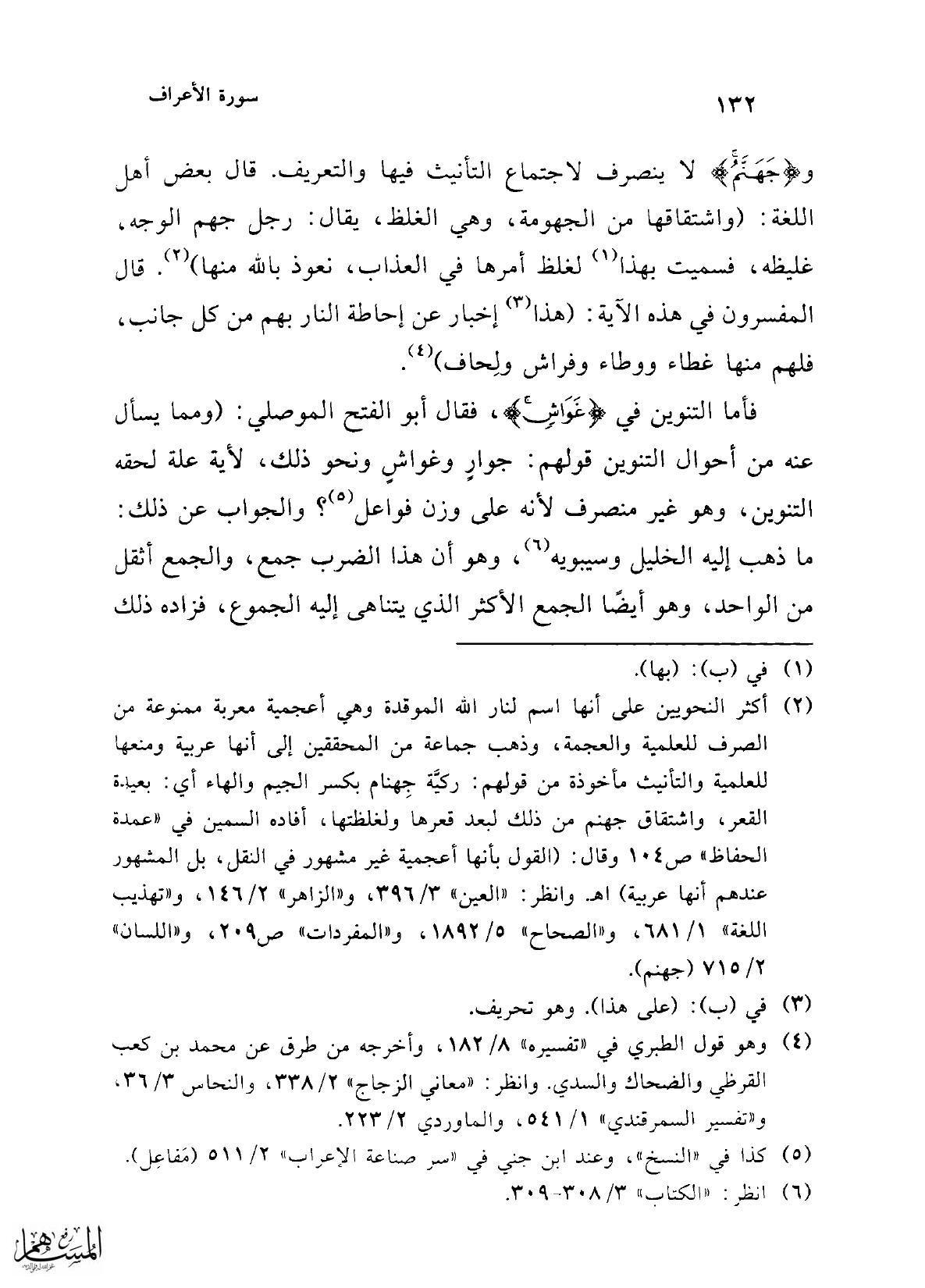 فأما التنوين في {غَوَاشٍ}، فقال أبو الفتح الموصلي: (ومما يسأل عنه من أحوال التنوين قولهم: جوارٍ وغواشٍ ونحو ذلك، لأية علة لحقه التنوين، وهو غير منصرف لأنه على وزن فواعل (¬5)؟ والجواب عن ذلك: ما ذهب إليه الخليل وسيبويه (¬6)، وهو أن هذا الضرب جمع، والجمع أثقل من الواحد، وهو أيضًا الجمع الأكثر الذي يتناهى إليه الجموع، فزاده ذلك