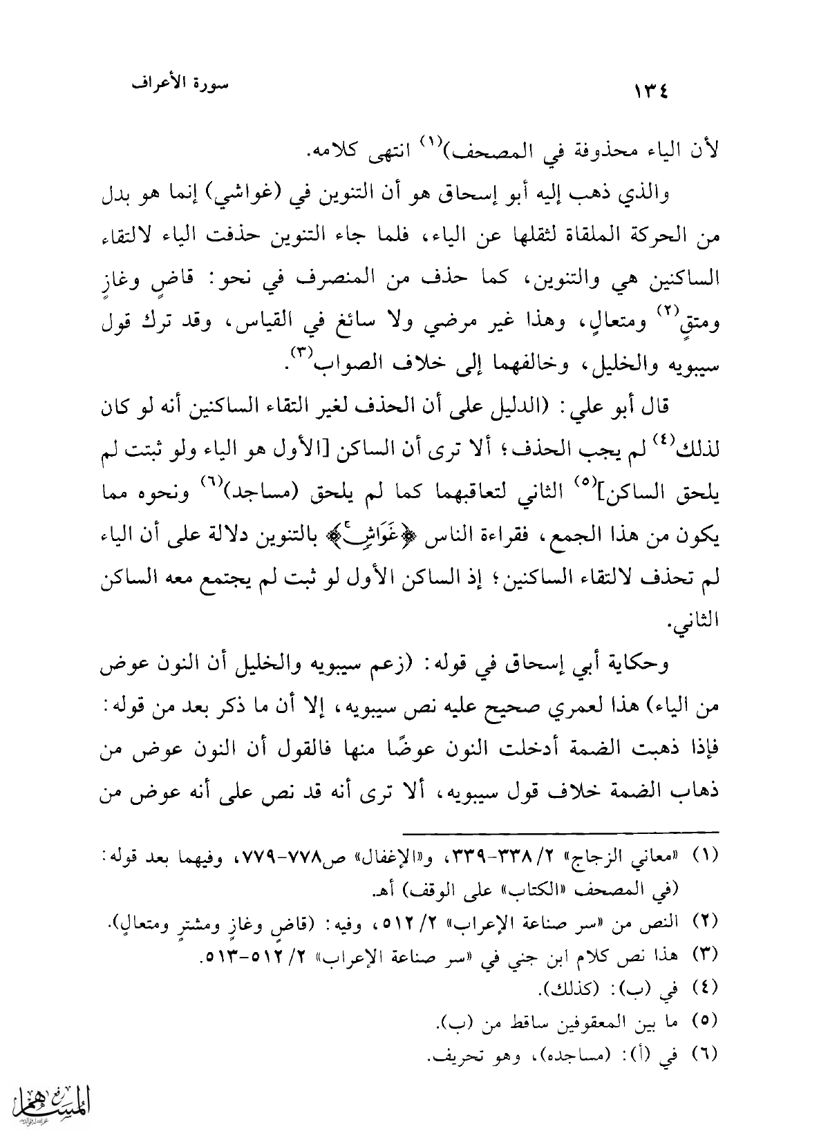 والذي ذهب إليه أبو إسحاق هو أن التنوين في (غواشي) إنما هو بدل من الحركة الملقاة لثقلها عن الياء، فلما جاء التنوين حذفت الياء لالتقاء الساكنين هي والتنوين، كما حذف من المنصرف في نحو: قاضٍ وغازٍ ومتقٍ (¬2) ومتعالٍ، وهذا غير مرضي ولا سائغ في القياس، وقد ترك قول سيبويه والخليل، وخالفهما إلى خلاف الصواب (¬3).