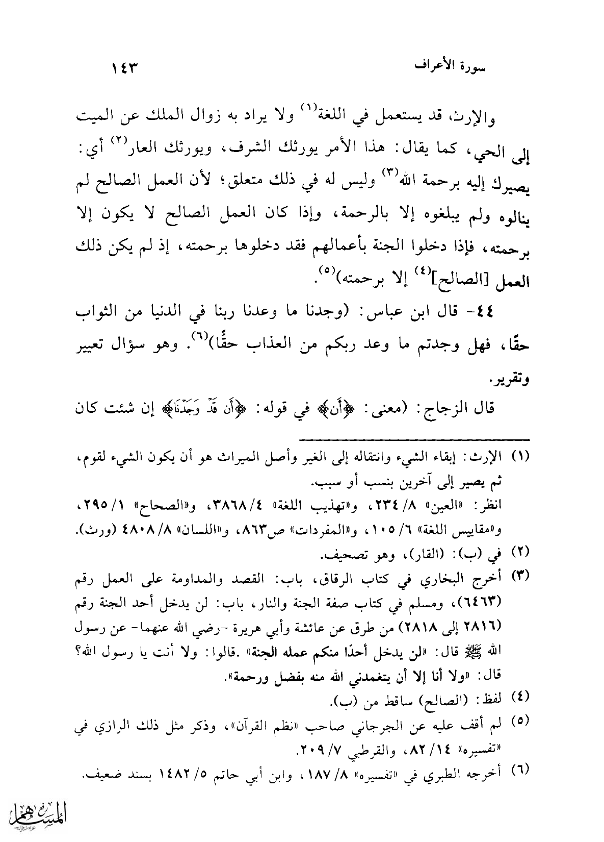 44 - قال ابن عباس: (وجدنا ما وعدنا ربنا في الدنيا من الثواب حقًا، فهل وجدتم ما وعد ربكم من العذاب حقًّا) (¬6). وهو سؤال تعيير وتقرير.