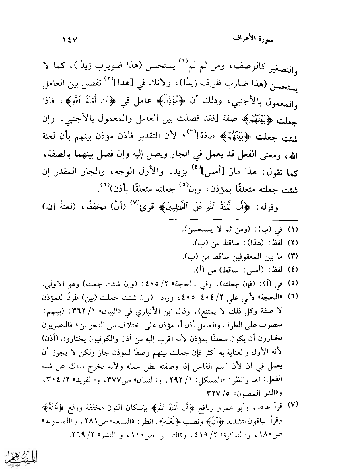 والتصغير كالوصف، ومن ثم لم (¬1) يستحسن (هذا ضويرب زيدًا)، كما لا يستحسن (هذا ضارب ظريف زيدًا)، ولأنك في [هذا] (¬2) تفصل بين العامل والمعمول بالأجنبي، وذلك أن {مُؤَذِّنٌ} عامل في {أَنْ لَعْنَةُ اللَّهِ}، فإذا جعلت {بَيْنَهُمْ} صفة [فقد فصلت بين العامل والمعمول بالأجنبي، وإن شئت جعلت {بَيْنَهُمْ} صفة] (¬3)؛ لأن التقدير فأذن مؤذن بينهم بأن لعنة الله، ومعنى الفعل قد يعمل في الجار ويصل إليه وإن فصل بينهما بالصفة، كما تقول: هذا مارّ [أمس] (¬4) يزيد، والأول الوجه، والجار المقدر إن شئت جعلته متعلقًا بمؤذن، وإن (¬5) جعلته متعلقًا بأذن) (¬6).