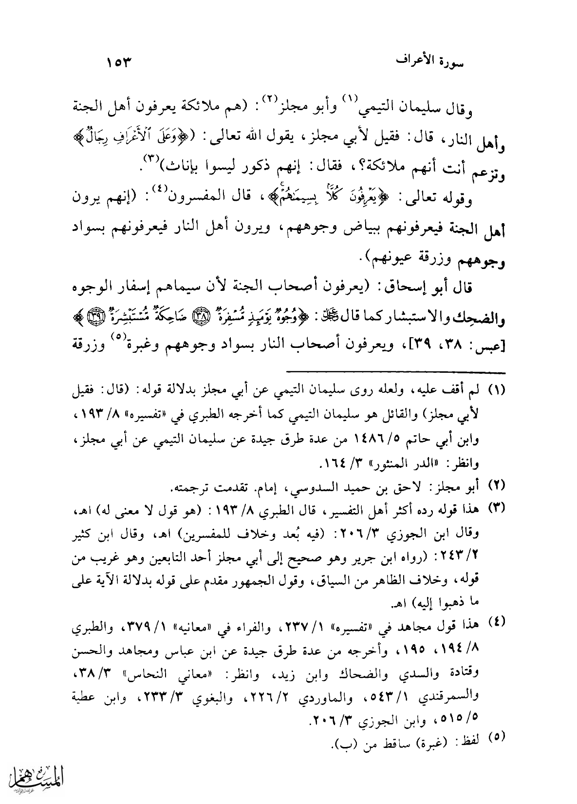 وقال سليمان التيمي (¬1) وأبو مجلز (¬2): (هم ملائكة يعرفون أهل الجنة وأهل النار، قال: فقيل لأبي مجلز، يقول الله تعالى: ({وَعَلَى الْأَعْرَافِ رِجَالٌ} وتزعم أنت أنهم ملائكة؟، فقال: إنهم ذكور ليسوا بإناث) (¬3).