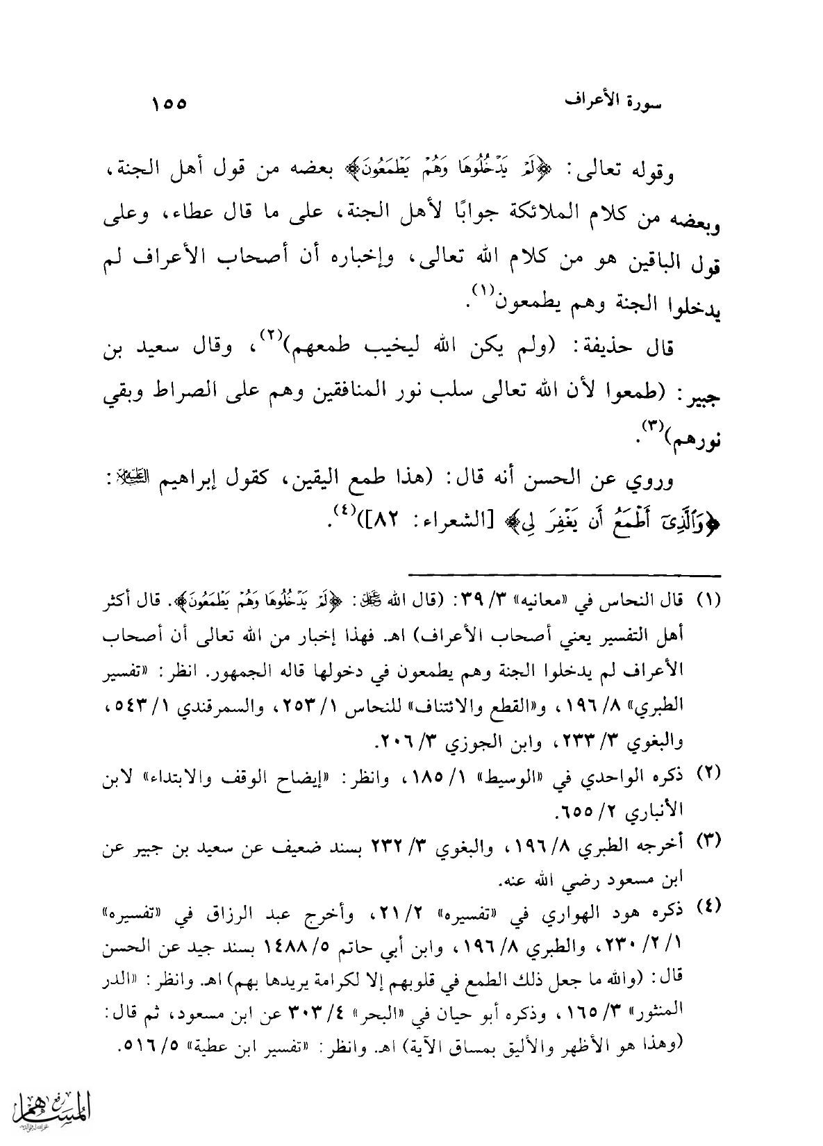 (¬1) قال النحاس في "معانيه" 3/ 39: (قال الله عز وجل: {لَمْ يَدْخُلُوهَا وَهُمْ يَطْمَعُونَ}. قال أكثر أهل التفسير يعني أصحاب الأعراف) اهـ. فهذا إخبار من الله تعالى أن أصحاب الأعراف لم يدخلوا الجنة وهم يطمعون في دخولها قاله الجمهور. انظر: "تفسير الطبري" 8/ 196، و"القطع والائتناف" للنحاس 1/ 253، والسمرقندي 1/ 543، والبغوي 3/ 233، وابن الجوزي 3/ 206.
