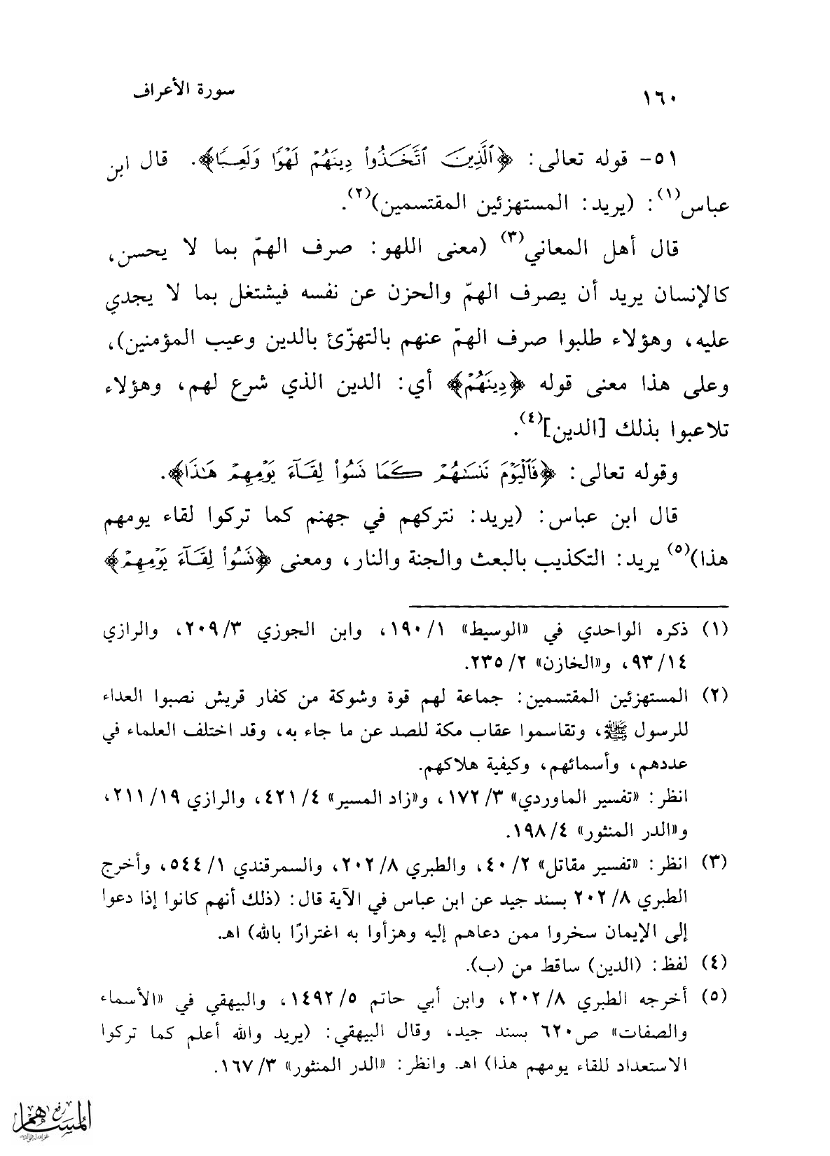 51 - قوله تعالى: {الَّذِينَ اتَّخَذُوا دِينَهُمْ لَهْوًا وَلَعِبًا}. قال ابن عباس (¬1): (يريد: المستهزئين المقتسمين) (¬2).