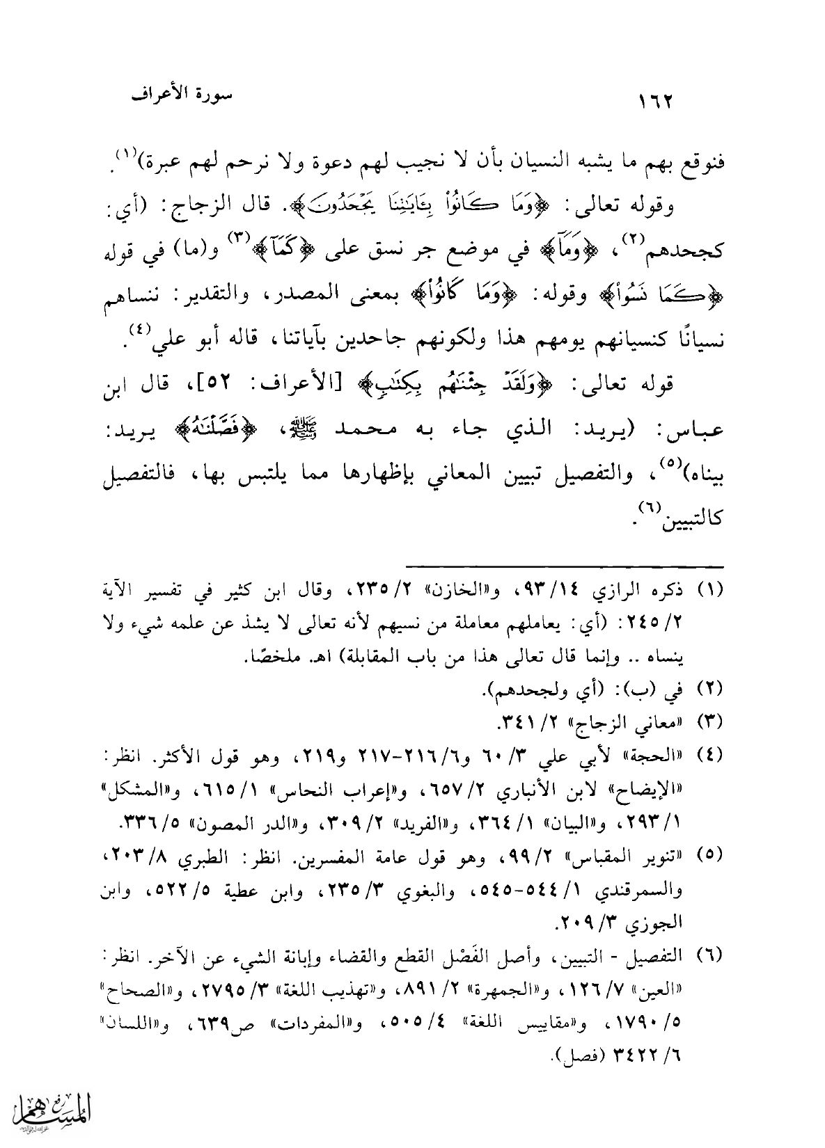 وقوله تعالى: {وَمَا كَانُوا بِآيَاتِنَا يَجْحَدُونَ}. قال الزجاج: (أي: كجحدهم (¬2)، {وَمَا} في موضع جر نسق على {كَمَا} (¬3) و (ما) في قوله {كَمَا نَسُوا} وقوله: {وَمَا كَانُوا} بمعنى المصدر، والتقدير: ننساهم نسيانًا كنسيانهم يومهم هذا ولكونهم جاحدين بآياتنا، قاله أبو علي (¬4).