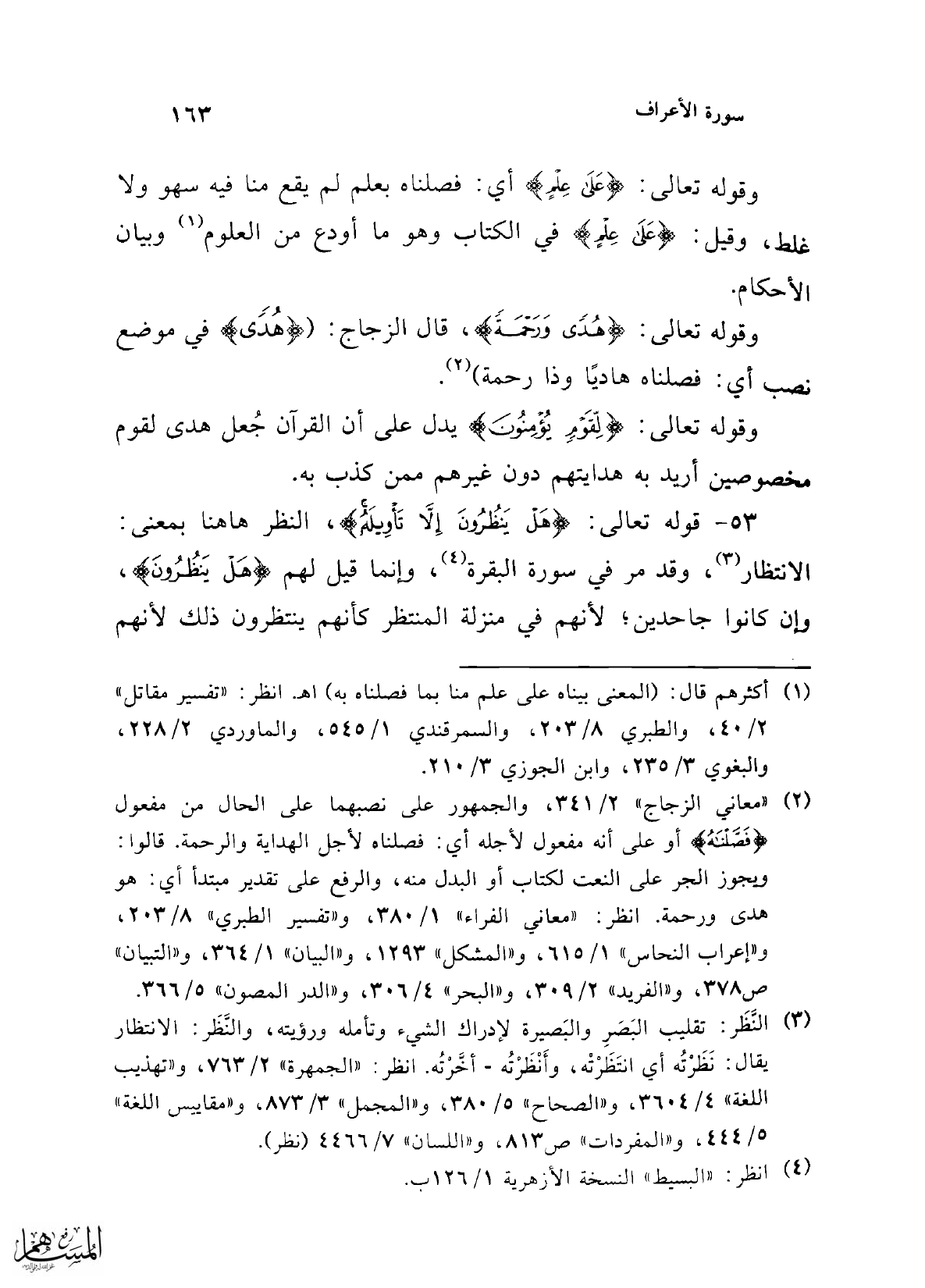(¬2) "معاني الزجاج" 2/ 341، والجمهور على نصبهما على الحال من مفعول {فَصَّلْنَاهُ} أو على أنه مفعول لأجله أي: فصلناه لأجل الهداية والرحمة. قالوا: ويجوز الجر على النعت لكتاب أو البدل منه، والرفع على تقدير مبتدأ أي: هو هدى ورحمة انظر: "معاني الفراء" 1/ 380، و"تفسير الطبري" 3/ 208، و"إعراب النحاس" 1/ 615، و"المشكل" 1293، و"البيان" 1/ 364، و"التبيان" ص 378، و"الفريد" 2/ 309، و"البحر" 4/ 306، و"الدر المصون" 5/ 366.