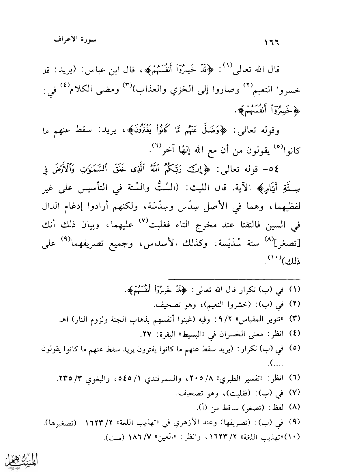 (¬9) في (ب): (تصريفها) وعند الأزهري في "تهذيب اللغة" 2/ 1623: (تصغيرها).