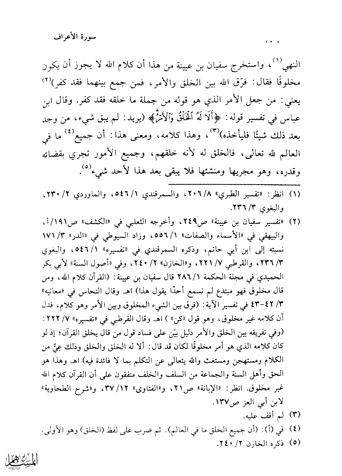 (¬2) "تفسير سفيان بن عيينة" ص 249، وأخرجه الثعلبي في "الكشف" ص 191/ أ، والبيهقي في "الأسماء والصفات" 1/ 556، وزاد السيوطي في "الدر" 3/ 171 نسبته إلى ابن أبي حاتم، وذكره السمرقندي في "تفسيره" 1/ 546، والبغوي 3/ 236، والقرطبي 7/ 221، و"الخازن" 2/ 240، وفي "أصول السنة" لأبي بكر الحميدي في مجلة الحكمة 1/ 286 قال سفيان بن عيينة: (القرآن كلام الله، ومن قال مخلوق فهو مبتدع لم نسمع أحدًا يقول هذا) اهـ. وقال النحاس في "معانيه" 3/ 42 - 43 في تفسير الآية: (فرق بين الشيء المخلوق وبين الأمر وهو كلام، فدل أن كلامه غير مخلوق، وهو قول "كن") اهـ. وقال القرطبي في "تفسيره" 7/ 222: (وفي تفريقه بين الخلق والأمر دليل بيّن على فساد قول من قال يخلق القرآن؛ إذ لو كان كلامه الذي هو أمر مخلوقًا لكان قد قال: ألا له الخلق والخلق وذلك عِيٌّ من الكلام ومستهجن ومستغث والله يتعالى عن التكلم بما لا فائدة فيه) اهـ. وهذا هو الحق وأهل السنة والجماعة من السلف والخلف متفقون على أن القرآن كلام الله غير مخلوق. انظر: "الإبانة" ص 21، و"الفتاوى" 12/ 37، و"شرح الطحاوية" لابن أبي العز ص 137.