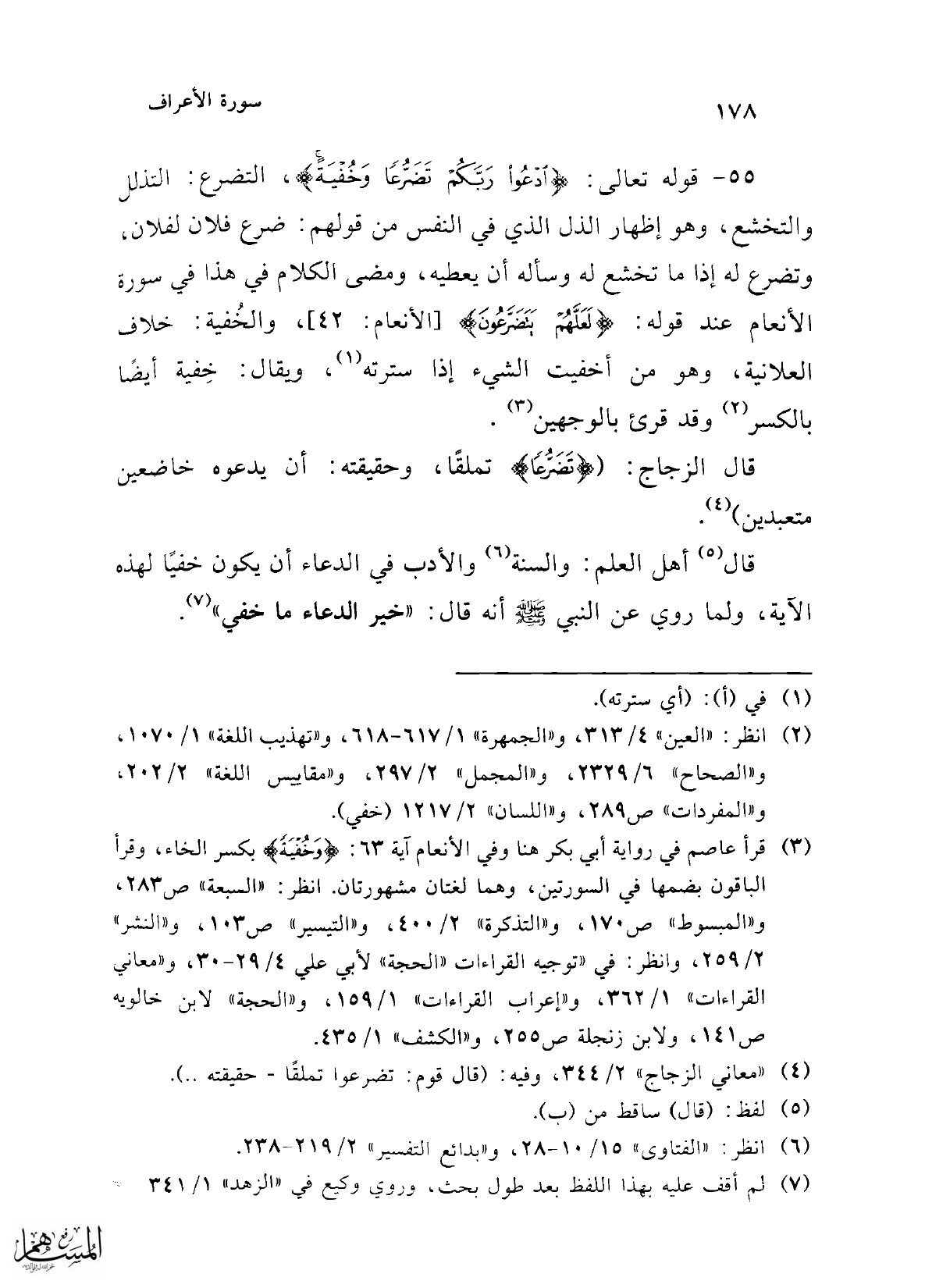 55 - قوله تعالى: {ادْعُوا رَبَّكُمْ تَضَرُّعًا وَخُفْيَةً}، التضرع: التذلل والتخشع، وهو إظهار الذل الذي في النفس من قولهم: ضرع فلان لفلان، وتضرع له إذا ما تخشع له وسأله أن يعطيه، ومضى الكلام في هذا في سورة الأنعام عند قوله: {لَعَلَّهُمْ يَتَضَرَّعُونَ} [الأنعام:42]، والخُفية: خلاف العلانية، وهو من أخفيت الشيء إذا سترته (¬1)، ويقال: خِفية أيضًا بالكسر (¬2) وقد قرئ بالوجهين (¬3).