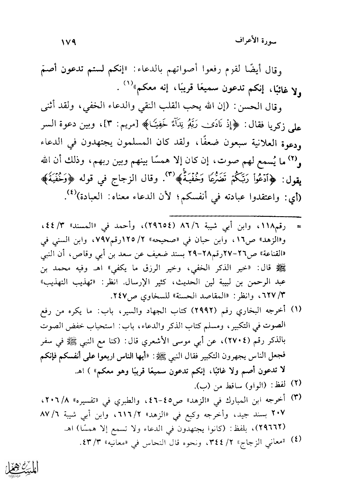 (¬1) أخرجه البخاري رقم (2992) كتاب الجهاد والسير، باب: ما يكره من رفع الصوت في التكبير، ومسلم كتاب الذكر والدعاء، باب: استحباب خفض الصوت بالذكر رقم (2704)، عن أبي موسى الأشعري قال: (كنا مع النبي - صلى الله عليه وسلم - في سفر فجعل الناس يجهرون التكبير فقال النبي - صلى الله عليه وسلم -: "أيها الناس اربعوا على أنفسكم فإنكم لا تدعون أصم ولا غائبًا، إنكم تدعون سميعا قريبًا وهو معكم") اهـ.
