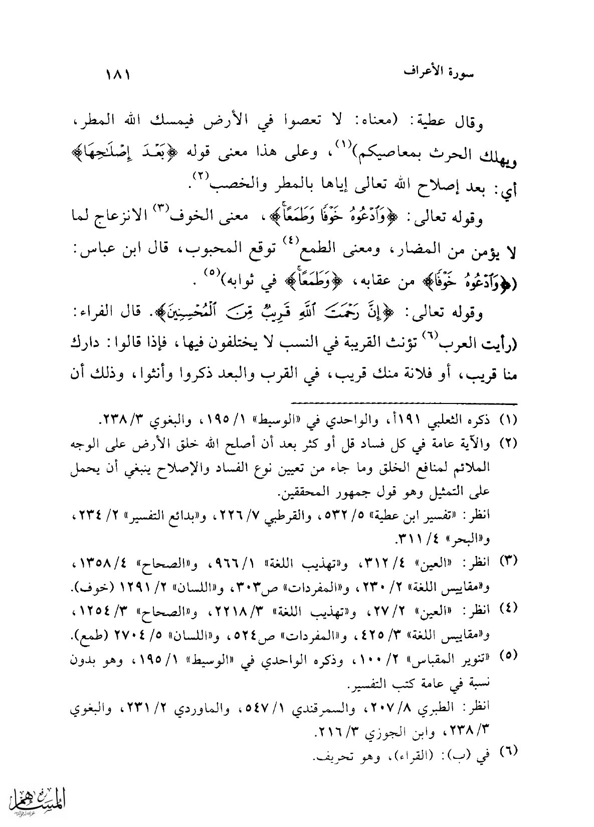 وقال عطية: (معناه: لا تعصوا في الأرض فيمسك الله المطر، ويهلك الحرث بمعاصيكم) (¬1)، وطى هذا معنى قوله {بَعْدَ إِصْلَاحِهَا} أي: بعد إصلاح الله تعالى إياها بالمطر والخصب (¬2).
