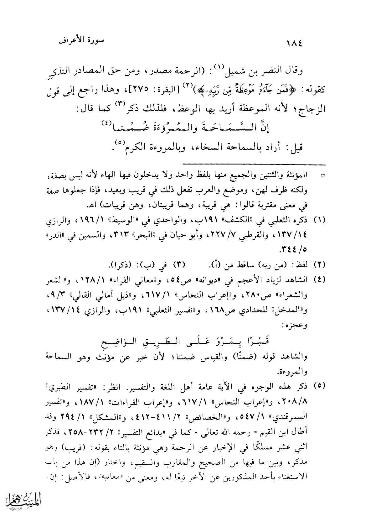 (¬5) ذكر هذه الوجوه في الآية عامة أهل اللغة والتفسير. انظر: "تفسير الطبري" 8/ 208، و"إعراب النحاس" 1/ 617، و"إعراب القراءات" 1/ 187، و"تفسير السمرقندي" 1/ 547، و"الخصائص" 2/ 411 - 412، و"المشكل" 1/ 294 وقد أطال ابن القيم -رحمه الله تعالى- كما في "بدائع التفسير" 2/ 232 - 258، فذكر اثني عشر مسلكًا في الإخبار عن الرحمة وهي مؤنثة بالتاء بقوله: (قريب) وهو مذكر، وبين ما فيها من الصحيح والمقارب والسقيم، واختار (إن هذا من باب الاستغناء بأحد المذكورين عن الآخر تبعًا له، ومعنى من "معانيه"، فالأصل: إن =