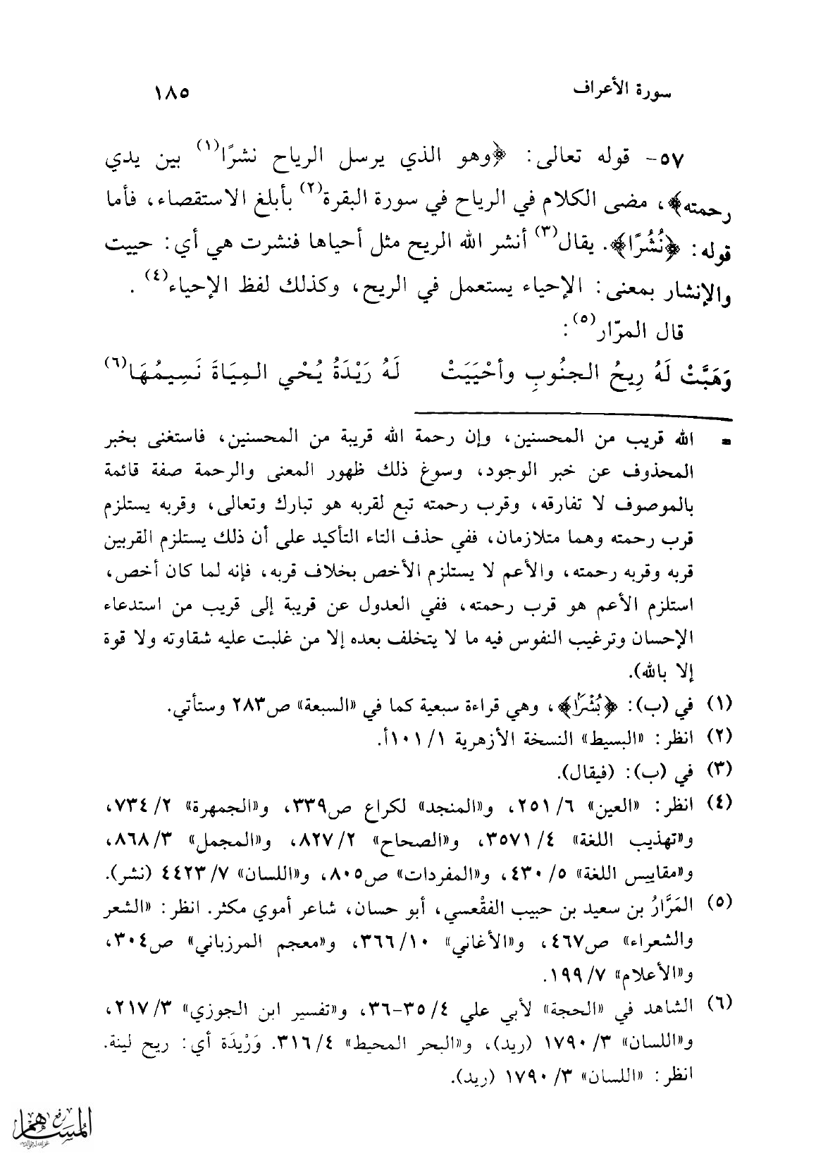 57 - قوله تعالى: {وهُوَ الذي يرسل الرياح نشرًا (¬1) بين يدي رحمته}، مضى الكلام في الرياح في سورة البقرة (¬2) بأبلغ الاستقصاء، فأما قوله: {نُشْرًا}. يقال (¬3) أنشر الله الريح مثل أحياها فنشرت هي أي: حييت والإنشار بمعنى: الإحياء يستعمل في الريح، وكذلك لفظ الإحياء (¬4).