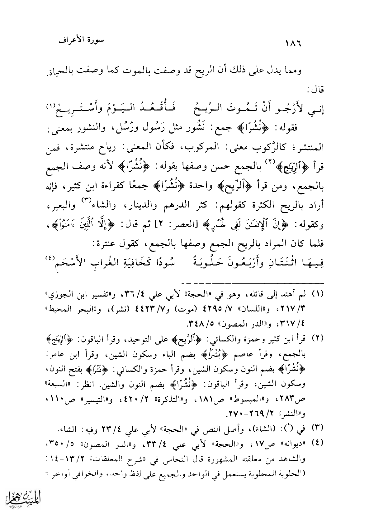 فقوله: {نُشُرًا} جمع: نشُور مثل رَسُول ورُسُل، والنشور بمعنى: المنتشر؛ كالرَّكوب معنى: المركوب، فكأن المعنى: رياح منتشرة، فمن قرأ {الرِّيَاحَ} (¬2) بالجمع حسن وصفها بقوله: {نُشُرًا} لأنه وصف الجمع بالجمع، ومن قرأ {الرِّيح} واحدة {نُشُرًا} جمعًا كقراءة ابن كثير، فإنه أراد بالريح الكثرة كقولهم: كثر الدرهم والدينار، والشاء (¬3) والبعير، وكقوله: {إِنَّ الْإِنْسَانَ لَفِي خُسْرٍ} [العصر: 2] ثم قال: {إِلَّا الَّذِينَ آمَنُوا}، فلما كان المراد بالريح الجمع وصفها بالجمع، كقول عنترة: