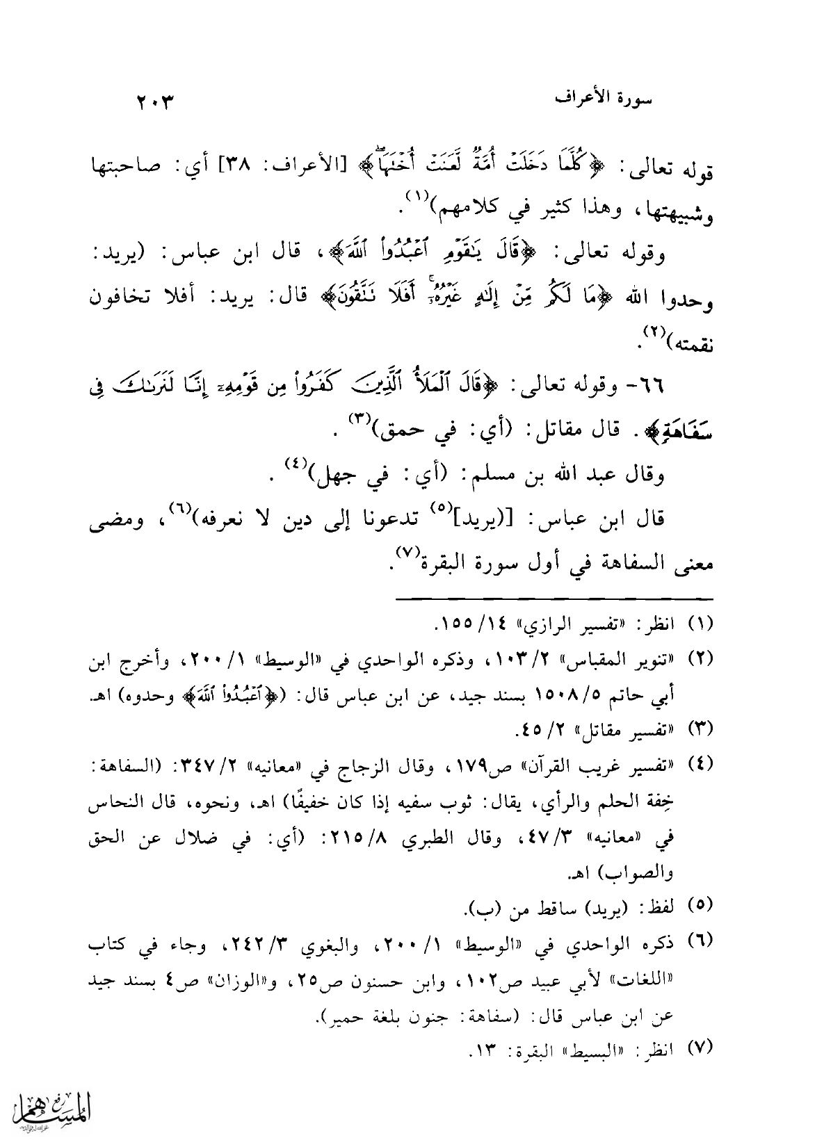 (¬6) ذكره الواحدي في "الوسيط" 1/ 200، والبغوي 3/ 242، وجاء في كتاب "اللغات" لأبي عبيد ص 152، وابن حسنون ص 25، و"الوزان" ص 4 بسند جيد عن ابن عباس قال: (سفاهة: جنون بلغة حمير).