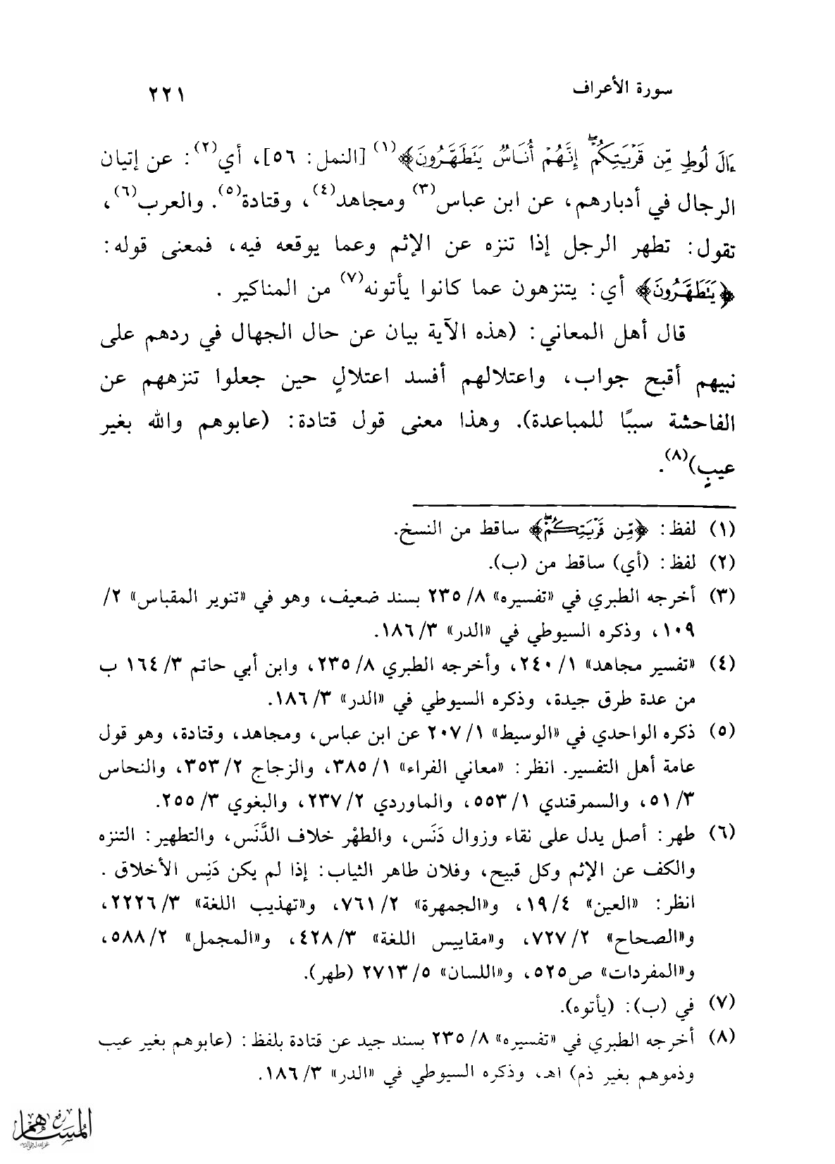 آلَ لُوطٍ مِنْ قَرْيَتِكُمْ إِنَّهُمْ أُنَاسٌ يَتَطَهَّرُونَ} (¬1) [النمل: 56]، أي (¬2): عن إتيان الرجال في أدبارهم، عن ابن عباس (¬3) ومجاهد (¬4)، وقتادة (¬5). والعرب (¬6)، تقول: تطهير الرجل إذا تنزه عن الإثم وعما يوقعه فيه، فمعنى قوله: {يَتَطَهَّرُونَ} أي: يتنزهون عما كانوا يأتونه (¬7) من المناكير.