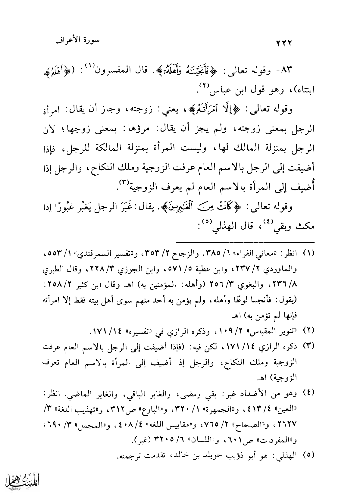 وقوله تعالى: {إِلَّا امْرَأَتَهُ}، يعني: زوجته، وجاز أن يقال: امرأة الرجل بمعنى زوجته، ولم يجز أن يقال: مرؤها: بمعنى زوجها؛ لأن الرجل بمنزلة المالك لها, ليست المرأة بمنزلة المالكة للرجل، فإذا أضيفت إلى الرجل بالاسم العام عرفت الزوجية وملك النكاح، والرجل إذا أُضيف إلى المرأة بالاسم العام لم يعرف الزوجية (¬3).