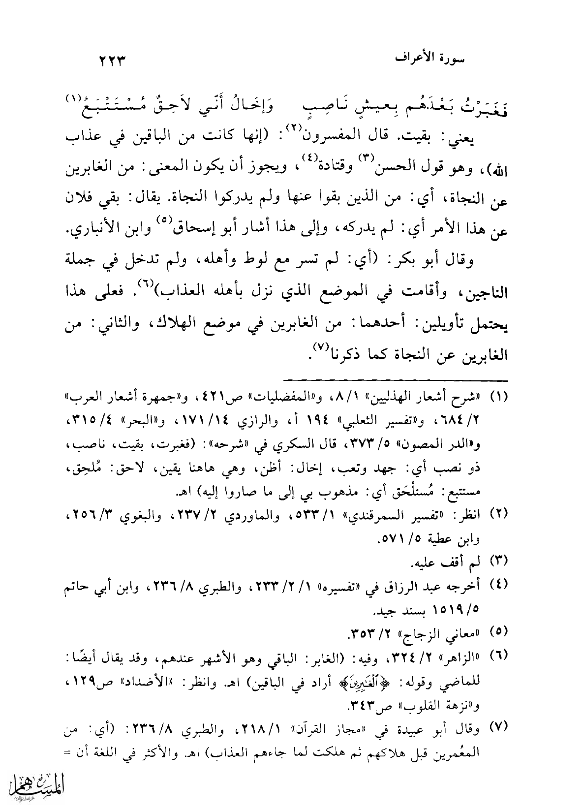 (¬6) "الزاهر" 2/ 324، وفيه: (الغابر: الباقي وهو الأشهر عندهم، وقد يقال أيضًا: للماضي وقوله: {الْغَابِرِينَ} أراد في الباقين) اهـ. وانظر: "الأضداد" ص 129، و"نزهة القلوب" ص 343.