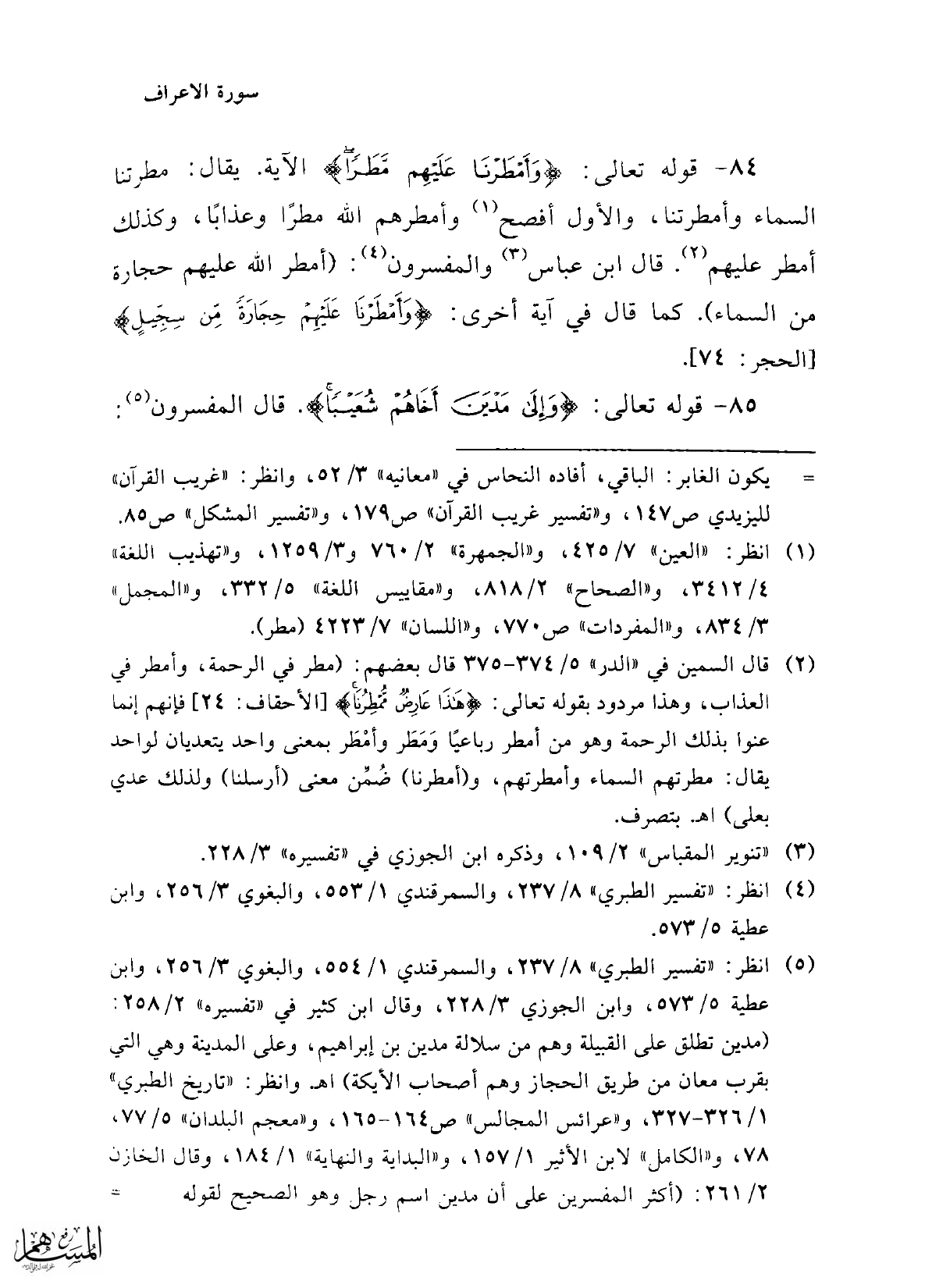 84 - قوله تعالى: {وَأَمْطَرْنَا عَلَيْهِمْ مَطَرًا} الآية. يقال: مطرتنا السماء وأمطرتنا، والأول أفصح (¬1) وأمطرهم الله مطرًا وعذابًا، وكذلك أمطر عليهم (¬2). قال ابن عباس (¬3) والمفسرون (¬4): (أمطر الله عليهم حجارة من السماء). كما قال في آية أخرى: {وَأَمْطَرْنَا عَلَيْهِمْ حِجَارَةً مِنْ سِجِّيلٍ} [الحجر: 74].