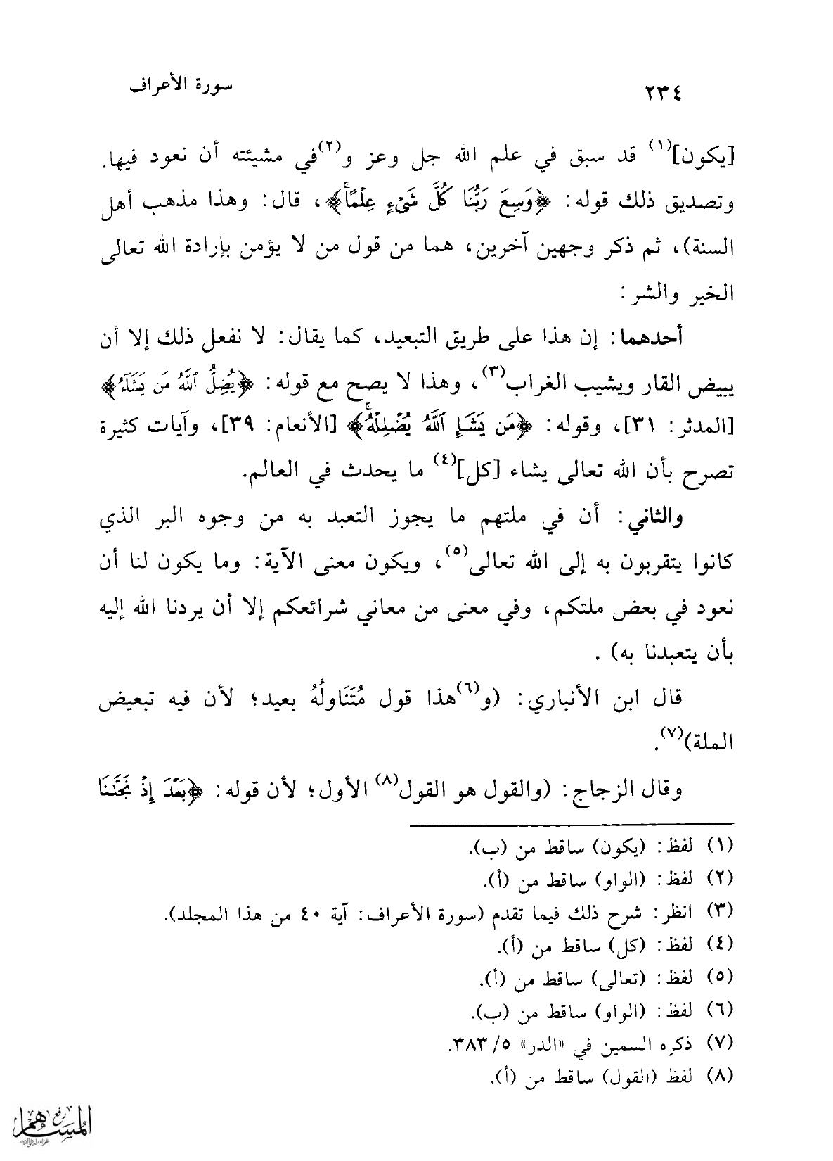 [يكون] (¬1) قد سبق في علم الله جل وعز و (¬2) في مشيئته أن نعود فيها. وتصديق ذلك قوله: {وَسِعَ رَبُّنَا كُلَّ شَيْءٍ عِلْمًا}، قال: وهذا مذهب أهل السنة)، ثم ذكر وجهين آخرين، هما من قول من لا يؤمن بإرادة الله تعالى الخير والشر: