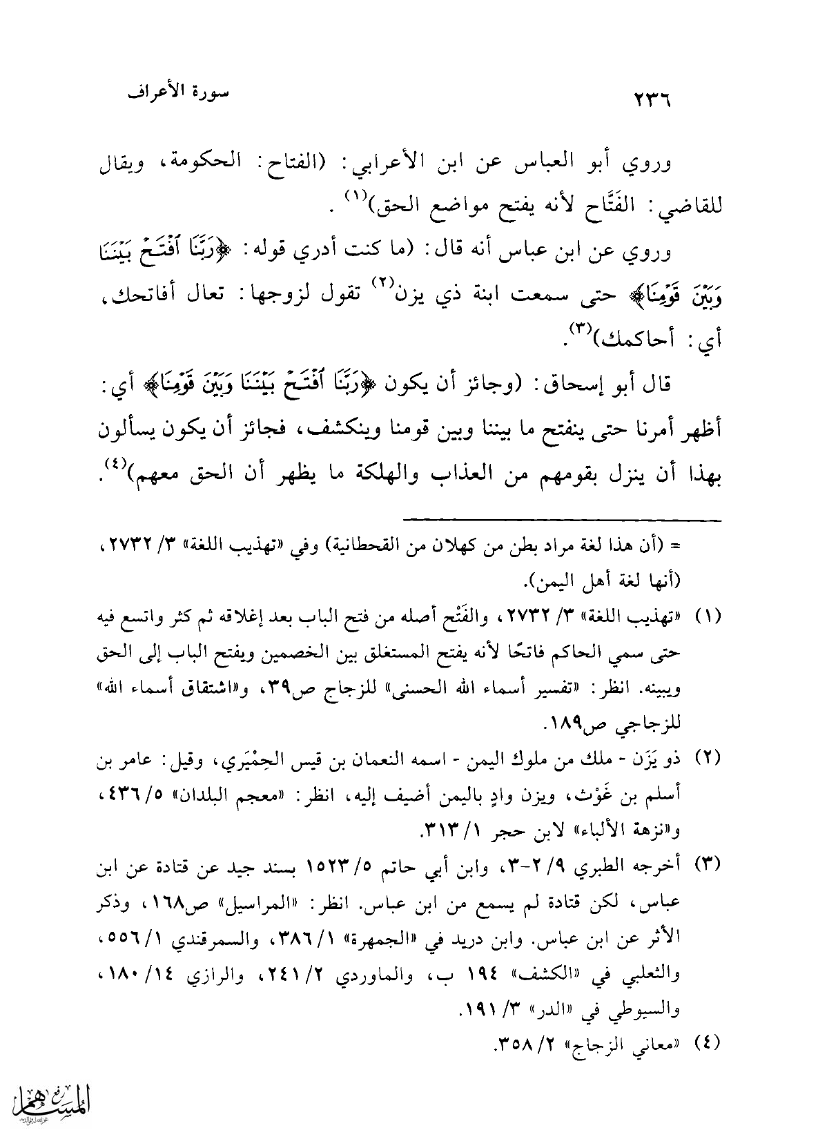 وروي عن ابن عباس أنه قال: (ما كنت أدري قوله: {رَبَّنَا افْتَحْ بَيْنَنَا وَبَيْنَ قَوْمِنَا} حتى سمعت ابنة ذي يزن (¬2) تقول لزوجها: تعال أفاتحك، أي: أحاكمك) (¬3).