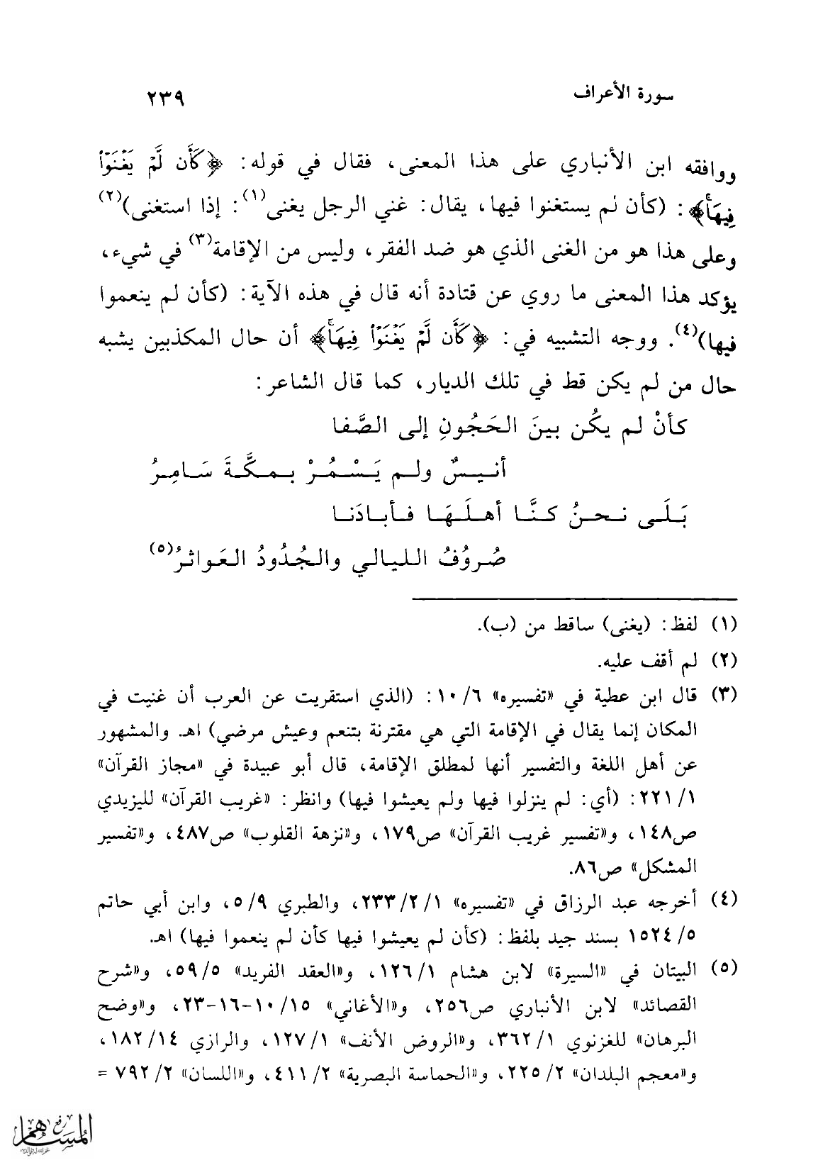 (¬3) قال ابن عطية في "تفسيره" 6/ 10: (الذي استقريت عن العرب أن غنيت في المكان إنما يقال في الإقامة التي هي مقترنة بتنعم وعيش مرضي) اهـ. والمشهور عن أهل اللغة والتفسير أنها لمطلق الإقامة، قال أبو عبيدة في "مجاز القرآن" 1/ 221: (أي: لم ينزلوا فيها ولم يعيشوا فيها) وانظر: "غريب القرآن" لليزيدي ص 148، و"تفسير غريب القرآن" ص 179، و"نزهة القلوب" ص 487، و"تفسير المشكل" ص 86.