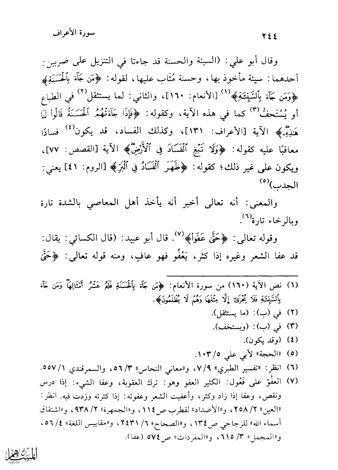 (¬1) نص الآية (160) من سورة الأنعام: {مَنْ جَاءَ بِالْحَسَنَةِ فَلَهُ عَشْرُ أَمْثَالِهَا وَمَنْ جَاءَ بِالسَّيِّئَةِ فَلَا يُجْزَى إِلَّا مِثْلَهَا وَهُمْ لَا يُظْلَمُونَ}.