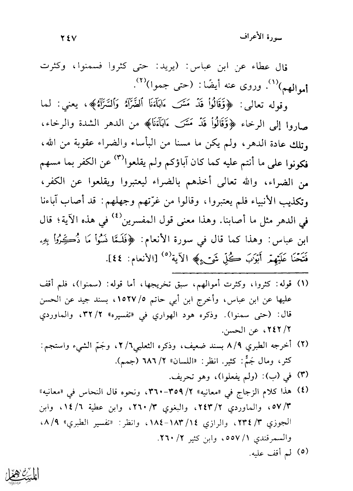 (¬1) قوله: كثروا، وكثرت أموالهم، سبق تخريجها، أما قوله: (سمنوا)، فلم أقف عليها عن ابن عباس، وأخرج ابن أبي حاتم 5/ 1527، بسند جيد عن الحسن قال: (حتى سمنوا). وذكره هود الهواري في "تفسيره" 2/ 32، والماوردي 2/ 242، عن الحسن.