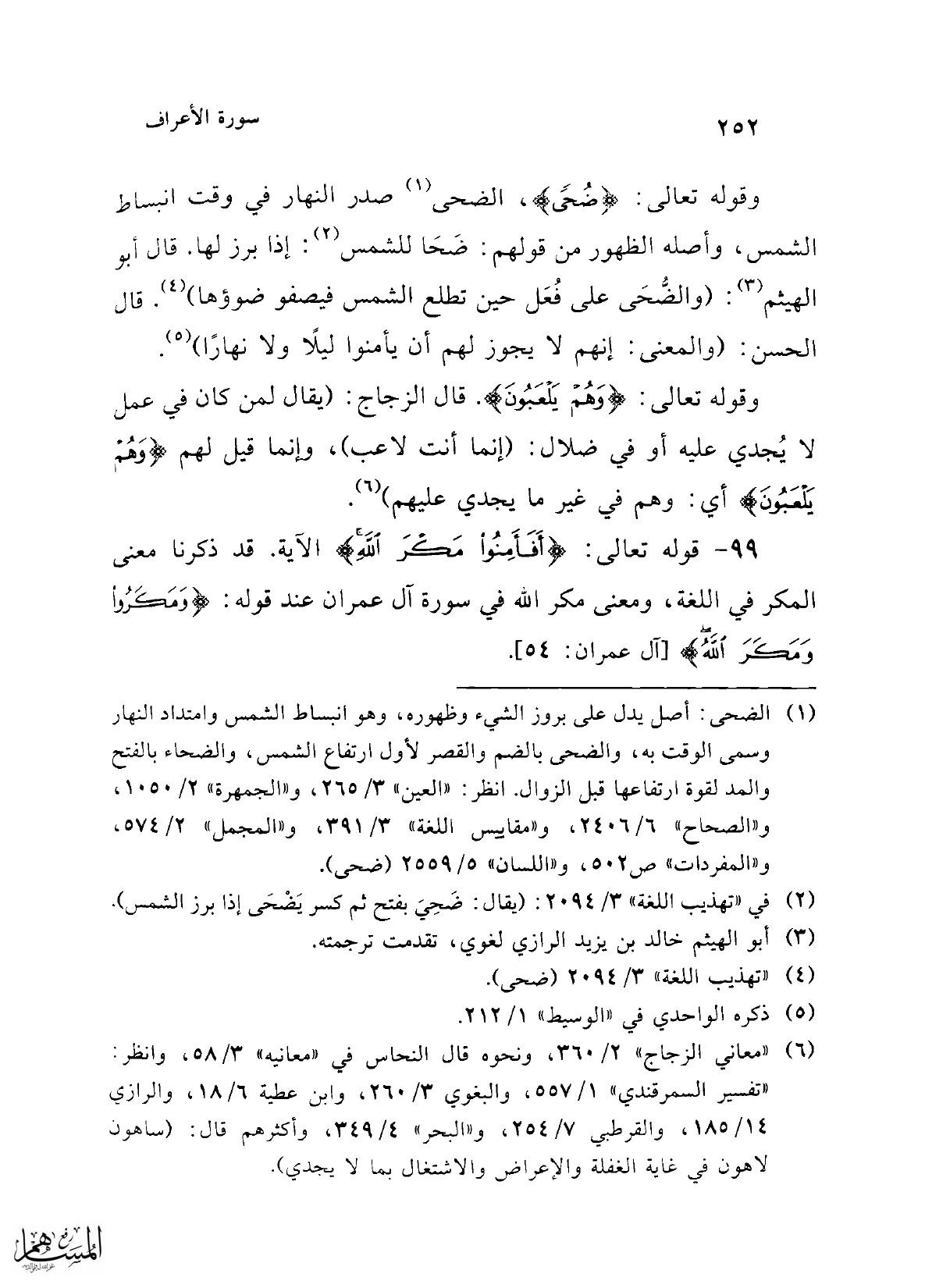 وقوله تعالى: {ضُحًى}، الضحى (¬1) صدر النهار في وقت انبساط الشمس، وأصله الظهور من قولهم: ضَحَا للشمس (¬2): إذا برز لها. قال أبو الهيثم (¬3): (والضُّحَى على فُعَل حين تطلع الشمس فيصفو ضوؤها) (¬4). قال الحسن: (والمعنى: إنهم لا يجوز لهم أن يأمنوا ليلاً ولا نهارًا) (¬5).