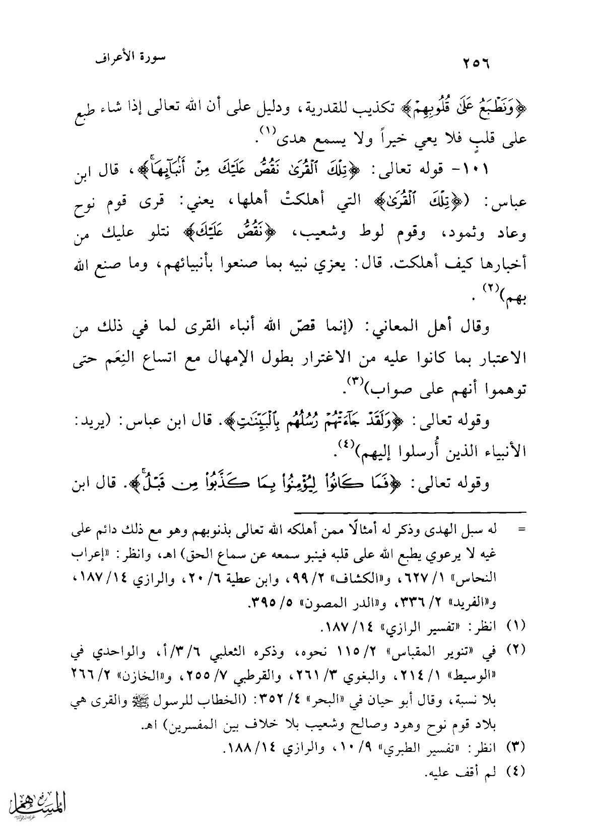 101 - قوله تعالى: {تِلْكَ الْقُرَى نَقُصُّ عَلَيْكَ مِنْ أَنْبَائِهَا}، قال ابن عباس: ({تِلْكَ الْقُرَى} التي أهلكتْ أهلها، يعني: قرى قوم نوح وعاد وثمود، وقوم لوط وشعيب، {نَقُصُّ عَلَيْكَ} نتلو عليك من أخبارها كيف أهلكت. قال: يعزي نبيه بما صنعوا بأنبيائهم، وما صنع الله بهم) (¬2).