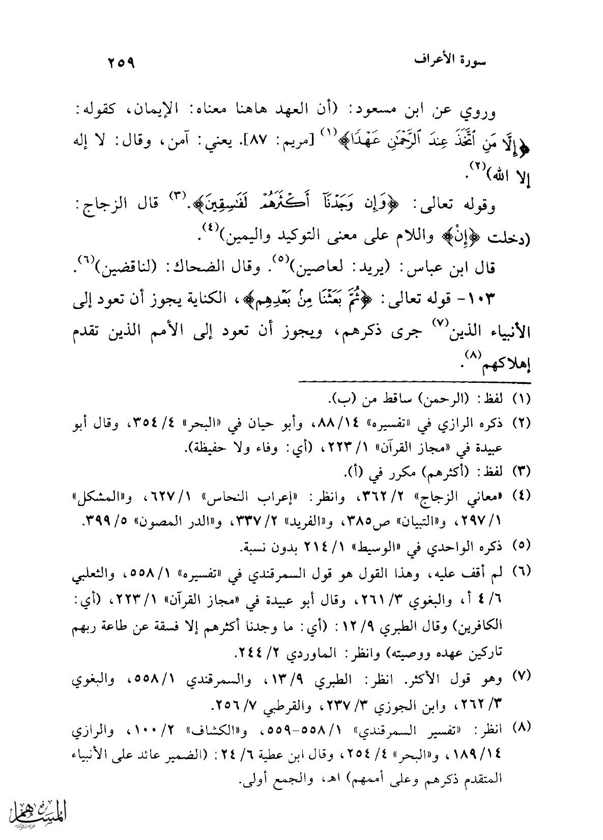 (¬8) انظر: "تفسير السمرقندي" 1/ 558 - 559، و"الكشاف" 2/ 100، والرازي 14/ 189، و"البحر" 4/ 254، وقال ابن عطية 6/ 24: (الضمير عائد على الأنبياء المتقدم ذكرهم وعلى أممهم) اهـ، والجمع أولى.