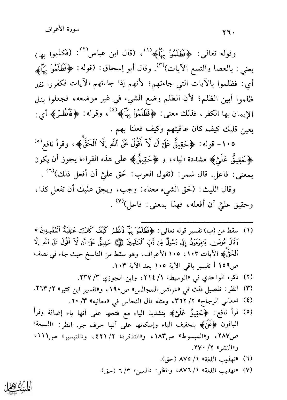 (¬1) سقط من (ب) تفسير قوله تعالى: {فَظَلَمُوا بِهَا فَانْظُرْ كَيْفَ كَانَ عَاقِبَةُ الْمُفْسِدِينَ (103) وَقَالَ مُوسَى يَا فِرْعَوْنُ إِنِّي رَسُولٌ مِنْ رَبِّ الْعَالَمِينَ (104) حَقِيقٌ عَلَى أَنْ لَا أَقُولَ عَلَى اللَّهِ إِلَّا الْحَقَّ} الآيات 103, 105 الأعراف, وهو سقط من الناسخ حيث جاء في نصف ص 159 أتفسير باقي الآية 105 بعد الآية 103.