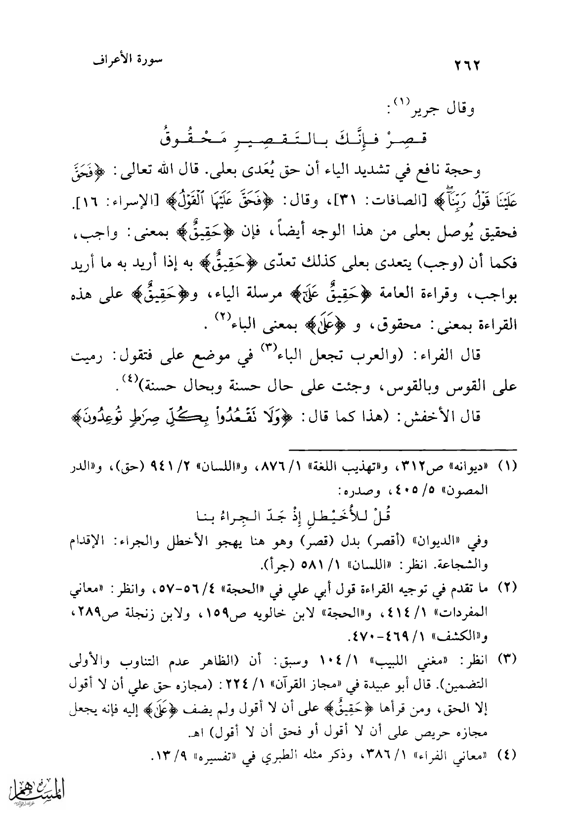 وحجة نافع في تشديد الياء أن حق يُعَدى بعلى. قال الله تعالى: {فَحَقَّ عَلَيْنَا قَوْلُ رَبِّنَا} [الصافات: 31]، وقال: {فَحَقَّ عَلَيْهَا الْقَوْلُ} [الإسراء: 16]. فحقيق يُوصل بعلى من هذا الوجه أيضاً، فإن {حَقِيقٌ} بمعنى: واجب، فكما أن (وجب) يتعدى بعلى كذلك تعدّى {حَقِيقٌ} به إذا أريد به ما أريد بواجب، وقراءة العامة {حَقِيقٌ عَلَى} مرسلة الياء، و {حَقِيقٌ} على هذه القراءة بمعنى: محقوق، و {عَلَى} بمعنى الباء (¬2).