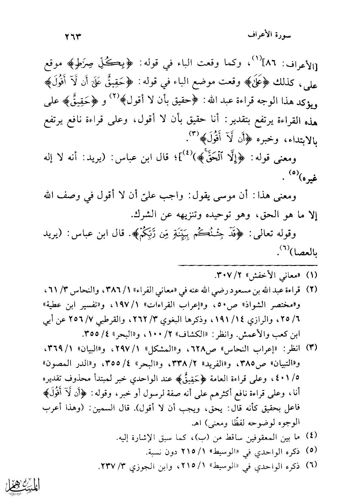 (¬3) انظر: "إعراب النحاس" ص 628، و"المشكل" 1/ 297، و"البيان" 1/ 369، و"التبيان" ص 385، و"الفريد" 2/ 338، و"البحر" 4/ 355، و"الدر المصون" 5/ 401، وعلى قراءة العامة {حَقِيقٌ} عند الواحدي خبر لمبتدأ محذوف تقديره أنا، وعلى قراءة نافع أكثرهم على أنه صفة لرسول أو خبر، وقوله: {أَنْ لَا أَقُولَ} فاعل بحقيق كأنه قال: يحق، ويجب أن لا أقول). قال السمين: (وهذا أعرب الوجوه لوضوحه لفظًا ومعنى) اهـ.