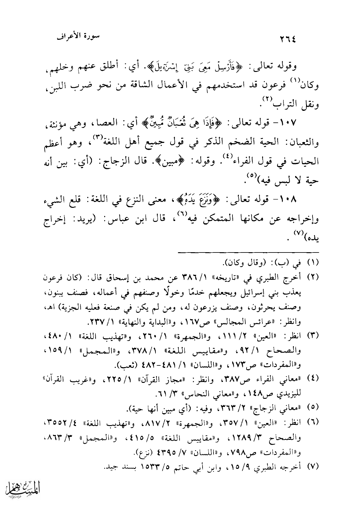 107 - قوله تعالى: {فَإِذَا هِيَ ثُعْبَانٌ مُبِينٌ} أي: العصا، وهي مؤنثة, والثعبان: الحية الضخم الذكر في قول جميع أهل اللغة (¬3)، وهو أعظم الحيات في قول الفراء (¬4). وقوله: {مُبِينٌ}. قال الزجاج: (أي: بين أنه حية لا لبس فيه) (¬5).