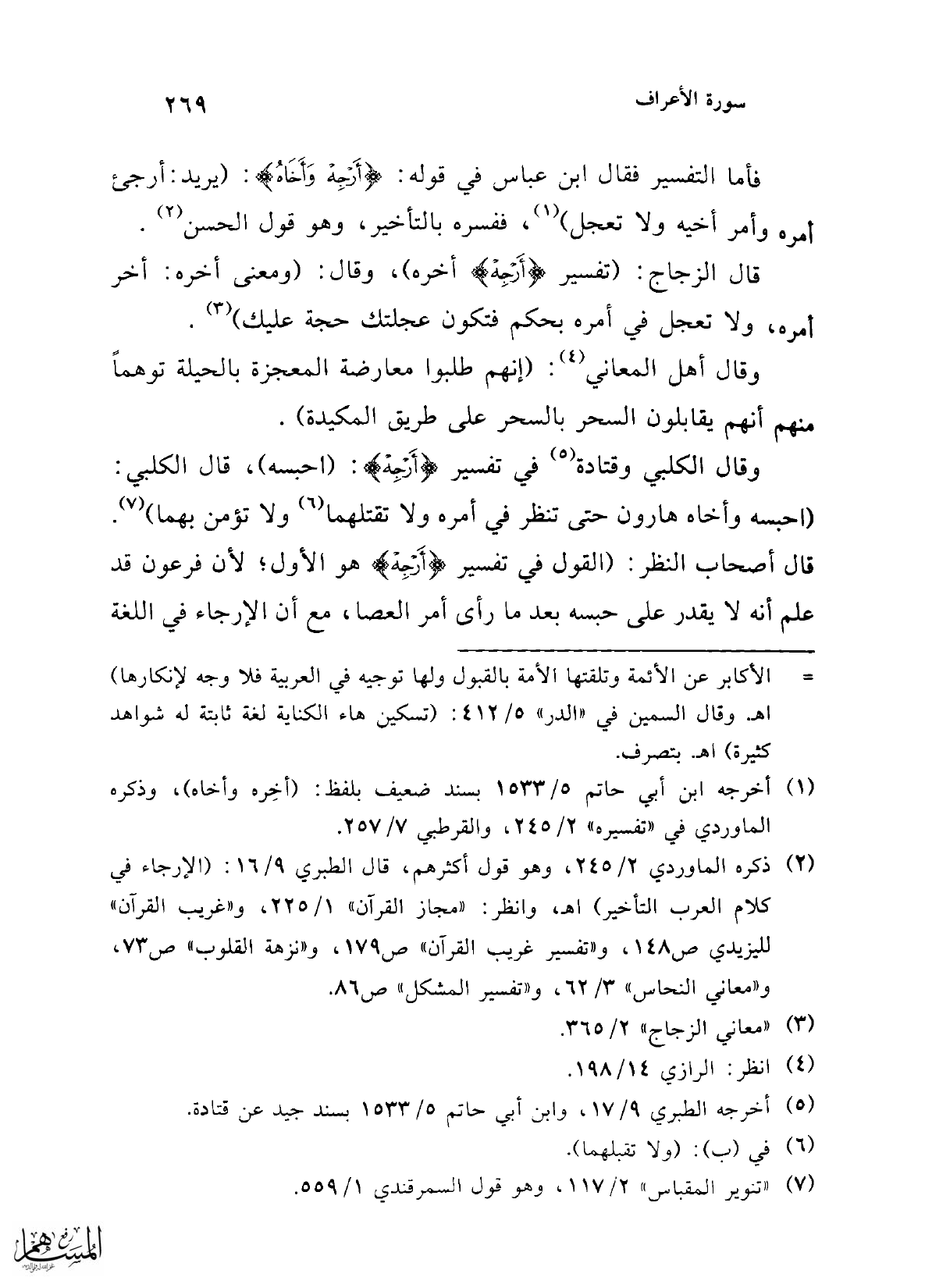 وقال الكلبي وقتادة (¬5) في تفسير {أَرْجِهْ}: (احبسه)، قال الكلبي: (احبسه وأخاه هارون حتى تنظر في أمره ولا تقتلهما (¬6) ولا تؤمن بهما) (¬7). قال أصحاب النظر: (القول في تفسير {أَرْجِهْ} هو الأول؛ لأن فرعون قد علم أنه لا يقدر على حبسه بعد ما رأى أمر العصا، مع أن الإرجاء في اللغة