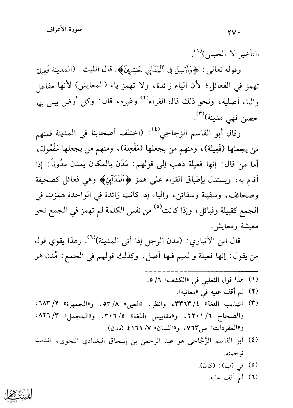 وقوله تعالى: {وَأَرْسِلْ فِي الْمَدَائِنِ حَاشِرِينَ}. قال الليث: (المدينة فَعِيلة تهمز في الفعائل؛ لأن الياء زائدة، ولا تهمز ياء (المعايش) لأنها مفاعل والياء أصلية، ونحو ذلك قال الفراء (¬2) وغيره، قال: وكل أرض يبنى بها حصن فهي مدينة) (¬3).