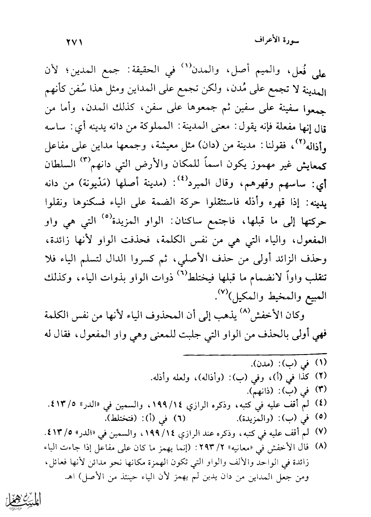 (¬8) قال الأخفش في "معانيه" 2/ 293: (إنما يهمز ما كان على مفاعل إذا جاءت الياء زائدة في الواحد والألف والواو التي تكون الهمزة مكانها نحو مدائن لأنها فعائل، ومن جعل المداين من دان يدين لم يهمز لأن الياء حينئذ من الأصل) اهـ.