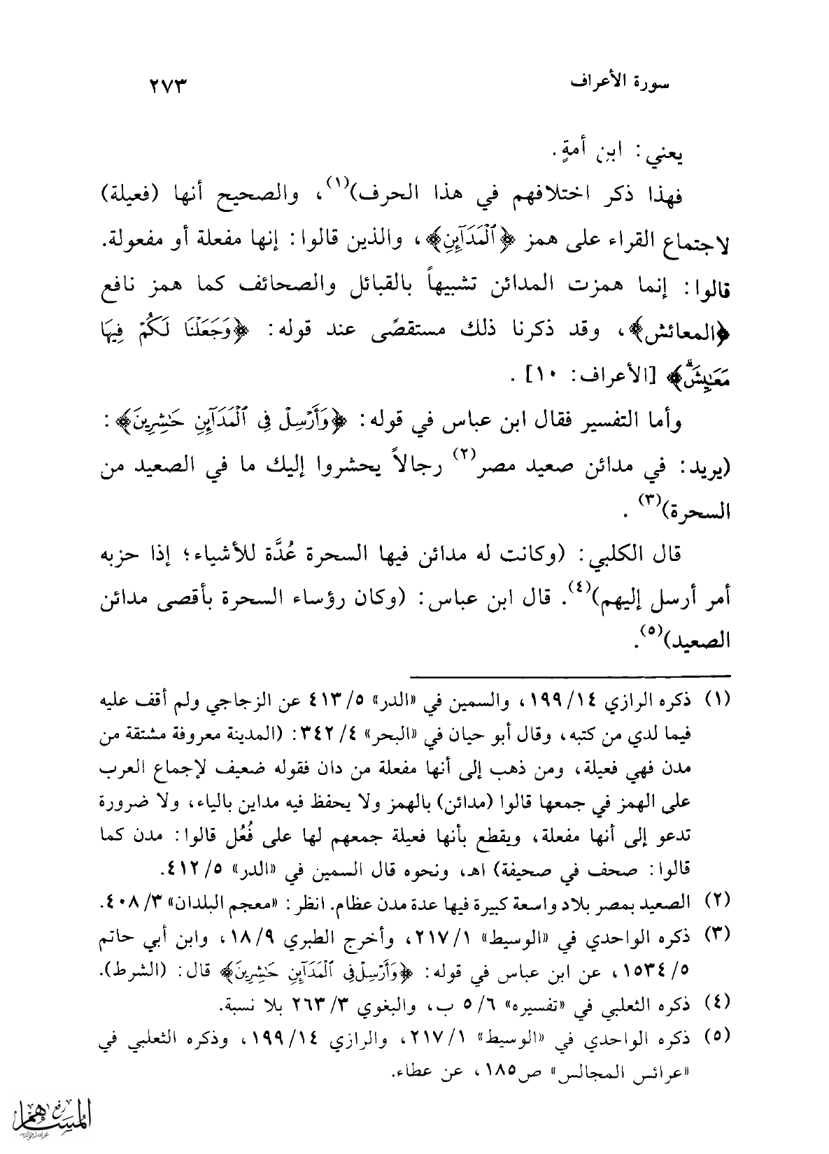 وأما التفسير فقال ابن عباس في قوله: {وَأَرْسِلْ فِي الْمَدَائِنِ حَاشِرِينَ}: (يريد: في مدائن صعيد مصر (¬2) رجالاً يحشروا إليك ما في الصعيد من السحرة) (¬3).