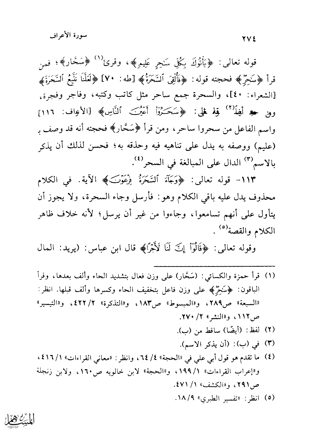 112 - قوله تعالى: {يَأْتُوكَ بِكُلِّ سَاحِرٍ عَلِيمٍ}، وقرئ (¬1) {سَحَّار}؛ فمن قرأ {سَاحِرٍ} فحجته قوله: {فَأُلْقِيَ السَّحَرَةُ} [طه: 70] {لَعَلَّنَا نَتَّبِعُ السَّحَرَةَ} [الشعراء: 40]، والسحرة جمع ساحر مثل كاتب وكتبه، وفاجر وفجرة، ومن حجته أيضًا (¬2) قوله تعالى: {سَحَرُوا أَعْيُنَ النَّاسِ} [الأعراف: 116]، واسم الفاعل من سحروا ساحر، ومن قرأ {سَحَّار} فحجته أنه قد وصف بـ (عليم) ووصفه به يدل على تناهيه فيه وحذقه به؛ فحسن لذلك أن يذكر بالاسم (¬3) الدال على المبالغة في السحر (¬4).