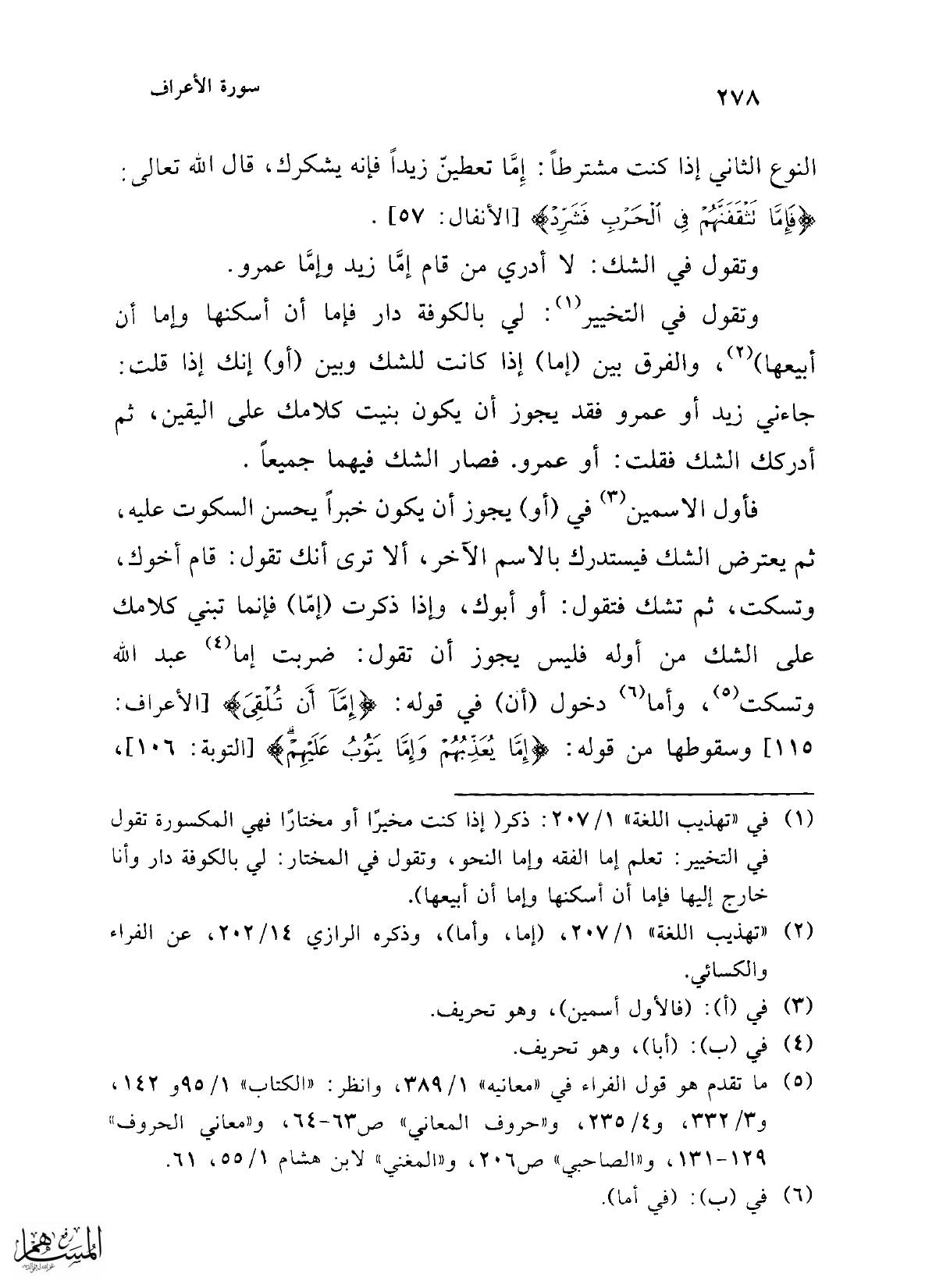 (¬2) "تهذيب اللغة" 1/ 207، (إما، وأما)، وذكره الرازي 14/ 202، عن الفراء والكسائي.