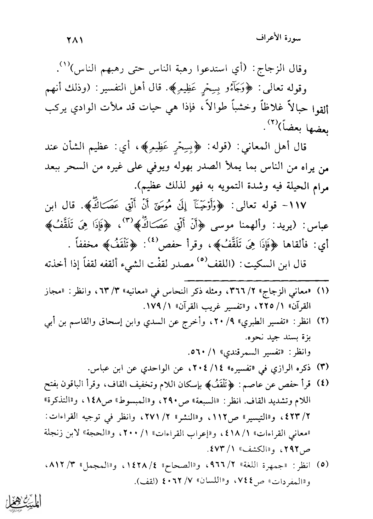 117 - قوله تعالى: {وَأَوْحَيْنَا إِلَى مُوسَى أَنْ أَلْقِ عَصَاكَ}. قال ابن عباس: (يريد: وألهمنا موسى {أَنْ أَلْقِ عَصَاكَ} (¬3)، {فَإِذَا هِيَ تَلْقَفُ} أي: فألقاها {فَإِذَا هِيَ تَلْقَفُ}، وقرأ حفص (¬4): {تَلْقَفُ} مخففاً.
